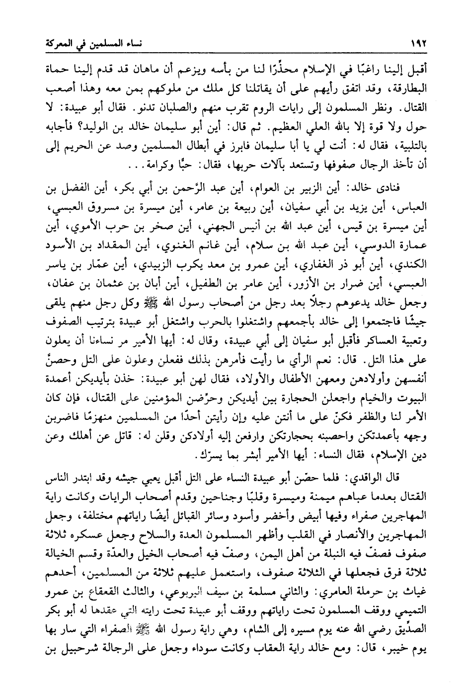فنادى خالد اين الزبير بن العوام أين عبد الرحمن بن أبي بكر أين الفضل بن العباس أين يزيد بن ابي سفيان أين ربيعة بن عامر أين ميسرة بن مسروق العبسي اين ميسرة بن قيس أين عبد الله بن أنيس الجهني أين صخر بن حرب الأموي أين عمارة الدوسي أين عبد الله بن سلام أين غانم الغنوي أين المقداد بن الأسود الكندي اين أبو ذر الغفاري اين عمرو بن معد يكرب الزبيدي أين عمار بن ياسر العبسي أين ضرار بن الأزور أين عامر بن الطفيل أين أبان بن عثمان بن عفان وجعل خالد يدعوهم رجلا بعد رجل من أصحاب رسول الله صلى الله عليه وسلم وكل رجل منهم يلقى جيشا فاجتمعوا إلى خالد بأجمعهم واشتغلوا بالحرب واشتغل أبو عبيدة بترتيب الصفوف وتعبية العساكر فأقبل أبو سفيان إلى ابي عبيدة وقال له: أيها الأمير مر نساءنا أن يعلون على هذا التل قال: نعم الرأي ما رأيت فأمرهن بذلك ففعلن وعلون على التل وحصن أنفسهم وأولادهن ومعهن الأطفال والأولاد فقال لهن أبو عبيدة خذن بأيديكن أعمدة البيوت والخيام وأجعلن الحجارة بين ايديكن وحرضن المؤمنين على القتال فإن كان الأمر لنا والظفر فكن على ما أنتن عليه وأن رأيتن أحدا من المسلمين منهزما فاضربن وجهه بأعمدتكن واحصبنه بحجارتكن وارفعن إليه أولادكن وقلن له قاتل عن أهلك وعن دين الإسلام فقال النساء أيها الأمير أبشر بما يسرك.