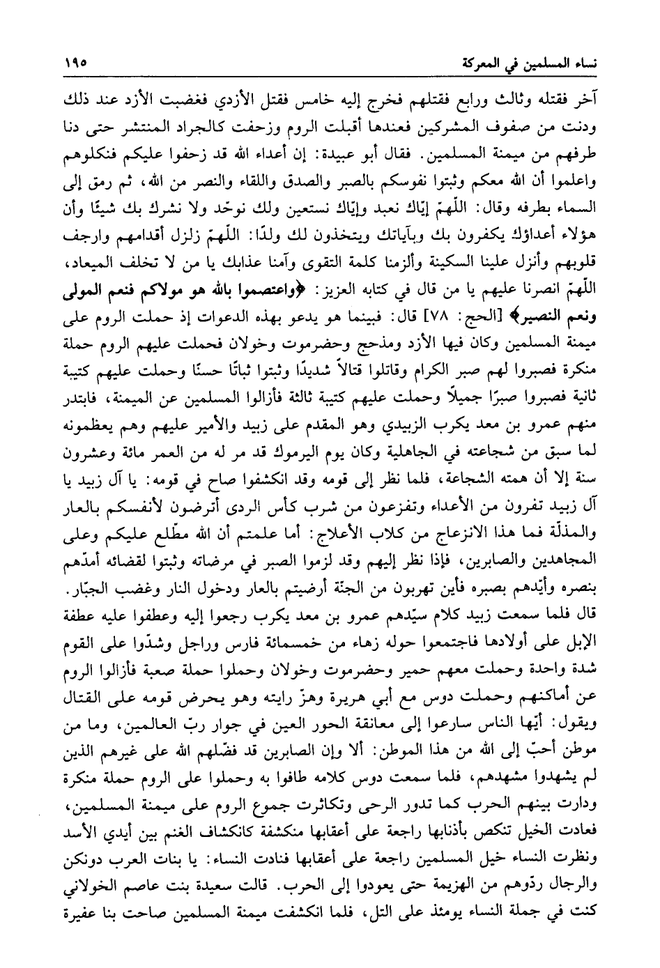 آخر فقتله وثالث ورابع فقتلهم فخرج إليه خامس فقتل الأزدي فغضبت الأزد عند ذلك ودنت من صفوف المشركين فعندها أقبلت الروم وزحفت كالجراد المنتشر حتى دنا طرفهم من ميمنة المسلمين فقال أبو عبيدة: أن أعداء الله قد زحفوا عليكم فنكلوهم واعلموا أن الله معكم وثبتوا نفوسكم بالصبر والصدق واللقاء والنصر من الله ثم رمق إلى السماء بطرفه وقال اللهم إياك نعبد وإياك نستعين ولك نوحد ولا نشرك بك شيئا وأن هؤلاء أعداؤك يكفرون بك وبآياتك ويتخذون لك ولدا اللهم زلزل أقدامهم وأرجف قلوبهم وأنزل علينا السكينة والزمنا كلمة التقوى وآمنا عذابك يا من لا تخلف الميعاد اللهم انصرنا عليهم يا من قال في كتابه العزيز: {وَاعْتَصِمُوا بِاللَّهِ هُوَ مَوْلاكُمْ فَنِعْمَ الْمَوْلَى وَنِعْمَ النَّصِيرُ} [الحج: 78] قال فبينما هو يدعو بهذه الدعوات إذ حملت الروم على ميمنة المسلمين وكان فيها الأزد ومذحج وحضرموت وخولان فحملت عليهم الروم حملة منكرة فصبروا لهم صبر الكرام وقاتلوا قتالا شديدا وثبتوا ثباتا حسنا وحملت عليهم كتيبة ثانية فصبروا صبرا جميلا وحملت عليهم كتيبة ثالثة فأزالوا المسلمين عن الميمنة فابتدر منهم عمرو بن معد يكرب الزبيدي وهو المقدم على زبيد والأمير عليهم وهم يعظمونه لما سبق من شجاعته في الجاهلية وكان يوم اليرموك قد مر له من العمر مائة وعشرون سنة إلا أن همته الشجاعة فلما نظر إلى قومه وقد إنكشفوا صاح في قومه يا آل زبيد يا آل زبيد تفرون من الأعداء وتفزعون من شرب كاس الردى أترضون لأنفسكم بالعار والمذلة فما هذا الأنزعاج من كلاب الأعلاج أما علمتم أن الله مطلع عليكم وعلى المجاهدين والصابرين فإذا نظر إليهم وقد لزموا الصبر في مرضاته وثبتوا لقضائه أمدهم بنصره وأيدهم بصبره فأين تهربون من الجنة أرضيتم بالعار ودخول النار وغضب الجبار قال فلما سمعت زبيد كلام سيدهم عمرو بن معد يكرب رجعوا إليه وعطفوا عليه عطفة الإبل على أولادها فاجتمعوا حوله زهاء من خمسمائة فارس وراجل وشدوا على القوم شدة واحدة وحملت معهم حمير وحضرموت وخولان وحملوا حملة صعبة فازالوا الروم عن أماكنهم وحملت دوس مع أبي هريرة وهز رايته وهو يحرض قومه على القتال ويقول: أيها الناس سارعوا إلى معانقة الحور العين في جوار رب العالمين وما من موطن أحب إلى الله من هذا الموطن إلا وأن الصابرين قد فضلهم الله على غيرهم الذين لم يشهدوا مشهدهم فلما سمعت دوس كلامه طافوا به وحملوا على الروم حملة منكرة ودارت بينهم الحرب كما تدور الرحى وتكاثرت جموع الروم على ميمنة المسلمين فعادت الخيل تنكص باذنابها راجعة على أعقابها منكشفة كانكشاف الغنم بين أيدي الاسد ونظرت النساء خيل المسلمين راجعة على أعقابها فنادت النساء يا بنات العرب دونكن والرجال ردوهم من الهزيمة حتى يعودوا إلى الحرب قالت سعيدة بنت عاصم الخولاني: كنت في جملة النساء يؤمئذ على التل فلما إنكشفت ميمنة المسلمين صاحت بنا عفيرة