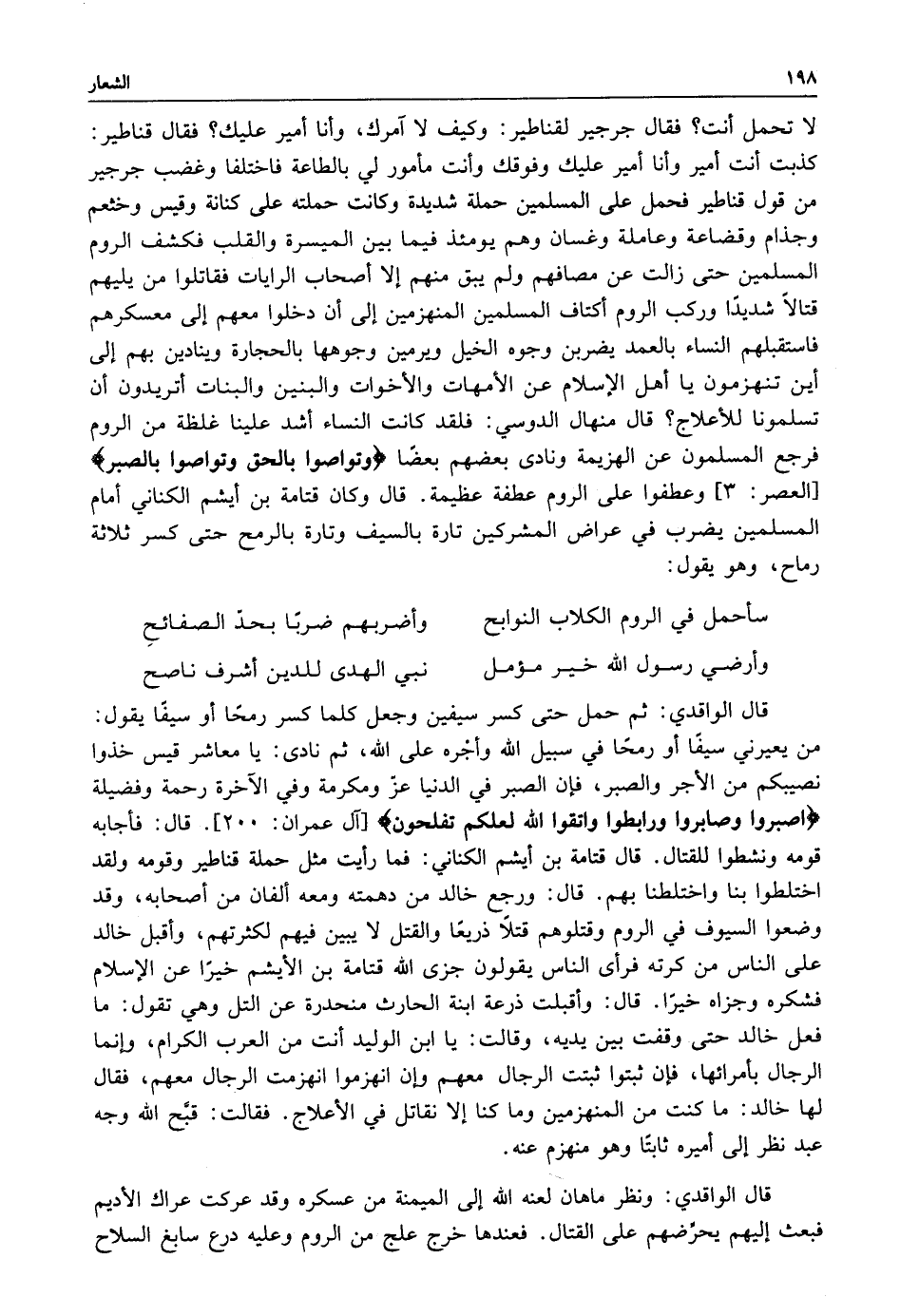 قال الواقدي: ثم حمل حتى كسر سيفين وجعل كلما كسر رمحا أو سيفا يقول: من يعيرني سيفا أو رمحا في سبيل الله وأجره على الله ثم نادى يا معاشر قيس خذوا نصيبكم من الأجر والصبر فإن الصبر في الدنيا عز ومكرمة وفي الآخرة رحمة وفضيلة ف {اصْبِرُوا وَصَابِرُوا وَرَابِطُوا وَاتَّقُوا اللَّهَ لَعَلَّكُمْ تُفْلِحُونَ} [آل عمران: 200] قال فاجابه قومه ونشطوا للقتال قال قتامة بن أيشم الكناني فما رأيت مثل حملة قناطر وقومه ولقد اختلطوا بنا واختلطنا بهم قال ورجع خالد من دهمته ومعه ألفان من أصحابه وقد وضعوا السيوف في الروم وقتلوهم قتلا ذريعا والقتل لا يبين فيهم لكثرتهم واقبل خالد على الناس من كرته فرأى الناس يقولون جزى الله قتامة بن الايشم خيرا عن الإسلام فشكره وجزاه خيرا قال وأقبلت ذرعه ابنة الحرث منحدرة عن التل وهي تقول ما فعل خالد حتى وقفت بين يديه وقالت: يا ابن الوليد أنت من العرب الكرام وإنما الرجال بامرائها فإن ثبتوا ثبتت الرجال معهم وأن انهزموا انهزمت الرجال معهم فقال لها خالد: ما كنت من المنهزمين وما كنا إلا نقاتل في الأعلاج فقالت: قبح الله وجه عبد نظر إلى أميره ثابتا وهو منهزم عنه.