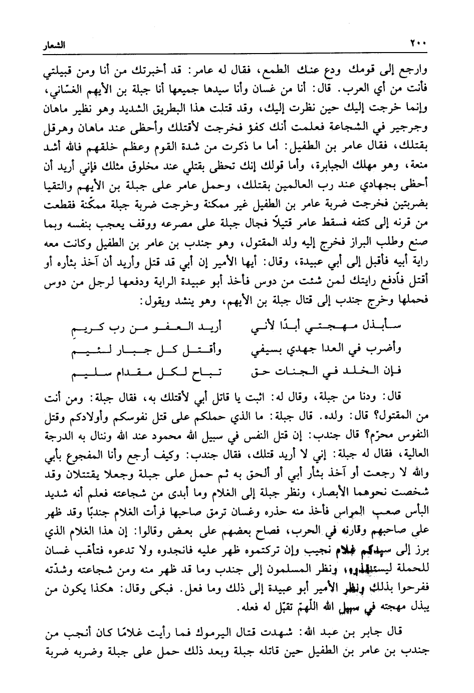 وارجع إلى قومك ودع عنك الطمع فقال له عامر: قد أخبرتك من أنا ومن قبيلتي فأنت من أي العرب قال أنا من غسان وأنا سيدها جميعها أنا جبلة بن الأيهم الغساني وإنما خرجت إليك حين نظرت إليك وقد قتلت هذا البطريق الشديد وهو نظير ماهان وجرجير في الشجاعة فعلمت إنك كفؤ فخرجت لاقتلك وأحظى عند ماهان وهرقل بقتلك فقال عامر بن الطفيل أما ما ذكرت من شدة القوم وعظم خلقهم فالله أشد منعة وهو مهلك الجبابرة وأما قولك إنك تحظى بقتلي عند مخلوق مثلك فاني أريد أن أحظى بجهادي عند رب العالمين بقتلك وحمل عامر على جبلة بن الأيهم والتقيا بضربتين فخرجت ضربة عامر بن الطفيل غير ممكنة وخرجت ضربة جبلة ممكنة فقطعت من قرنه إلى كتفه فسقط عامر قتيلا فجال جبلة على مصرعه ووقف يعجب بنفسه وبما صنع وطلب البراز فخرج إليه ولد المقتول وهو جندب بن عامر بن الطفيل وكانت معه راية أبيه فاقبل إلى ابي عبيدة وقال: أيها الأمير أن أبي قد قتل وأريد أن أخذ بثأره أو أقتل فادفع رايتك لمن شئت من دوس فأخذ أبو عبيدة الراية ودفعها لرجل من دوس فحملها وخرج جندب إلى قتال جبلة بن الأيهم وهو ينشد ويقول: