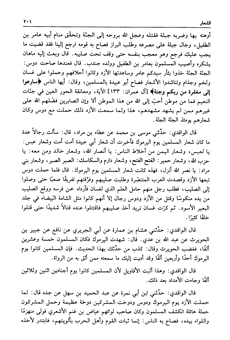 أوهته بها وضربه جبلة فقتله وعجل الله بروحه إلى الجنة وتحقق منام ابيه عامر بن الطفيل وجال جبلة على مصرعه وطلب البراز فصاح به قومه ارجع إلينا فقد قضيت ما يجب عليك فرجع وهو معجب بنفسه حتى وقف تحت صليبه قال وبعث إليه ماهان يشكره وأصيب المسلمون بعامر بن الطفيل وولده جندب قال فعندها صاحت دوس الجنة الجنة خذوا بثأر سيدكم عامر وساعدتها الأزد وكانوا احلافهم وحملوا على غسان ولخم وجذام وتناشدوا الاشعار فصاح أبو عبيدة بالمسلمين وقال: أيها الناس: {وَسَارِعُوا إِلَى مَغْفِرَةٍ مِنْ رَبِّكُمْ وَجَنَّةٍ} [آل عمران: 133] الآية ومعانقة الحور العين في جنات النعيم فما من موطن أحب إلى الله من هذا الموطن إلا وأن الصابرين فضلهم الله على غيرهم ممن لم يشهد مشهدهم هذا ولما سمعت الأزد ذلك حملت مع دوس وكان شعارهم يؤمئذ الجنة الجنة.