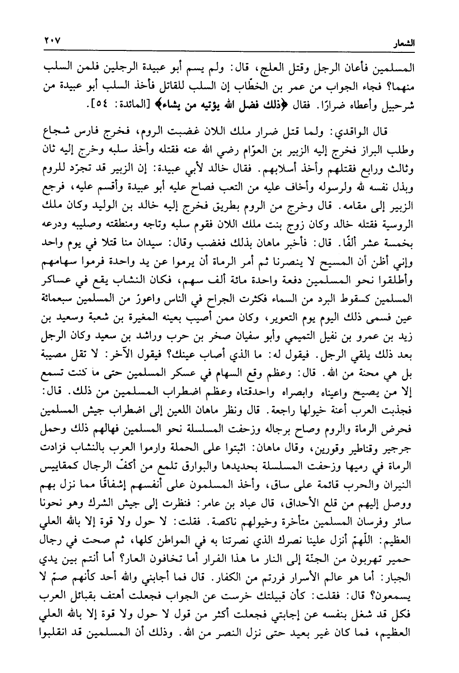 قال الواقدي: ولما قتل ضرار ملك اللان غضبت الروم فخرج فارس شجاع وطلب البراز فخرج إليه الزبير بن العوام رضي الله عنه فقتله وأخذ سلبه وخرج إليه ثان وثالث ورابع فقتلهم وأخذ أسلابهم فقال خالد لأبي عبيدة: أن الزبير قد تجرد للروم وبذل نفسه لله ولرسوله وأخاف عليه من التعب فصاح عليه أبو عبيدة وأقسم عليه فرجع الزبير إلى مقامه قال وخرج من الروم بطريق فخرج إليه خالد بن الوليد وكان ملك الروسية فقتله خالد وكان زوج بنت ملك اللان فقوم سلبه وتاجه ومنطقته وصليبه ودرعه بخمسة عشر ألفا قال فأخبر ماهان بذلك فغضب وقال سيدان منا قتلا في يوم واحد وإني أظن أن المسيح لا ينصرنا ثم أمر الرماة أن يرموا عن يد واحدة فرموا سهامهم وأطلقوا نحو المسلمين دفعة واحدة مائة ألف سهم فكان النشاب يقع في عساكر المسلمين كسقوط البرد من السماء فكثرت الجراح في الناس وأعور من المسلمين سبعمائة عين فسمى ذلك اليوم يوم التعوير وكان ممن أصيب بعينه المغيرة ابن شعبة وسعيد بن زيد بن عمرو بن نفيل التميمي وأبو سفيان صخر بن حرب وراشد بن سعيد وكان الرجل بعد ذلك يلقي الرجل فيقول له: ما الذي أصاب عينك فيقول الآخر: لا تقل مصيبة بل هي محنة من الله قال وعظم وقع السهام في عسكر المسلمين حتى ما كنت تسمع إلا من يصيح واعينا وابصراه واحدقتاه وعظم اضطراب المسلمين من ذلك قال فجذبت العرب أعنة خيولها راجعة قال ونظر ماهان اللعين إلى اضطراب جيش المسلمين فحرض الرماة والروم وصاح برجاله وزحفت المسلسلة نحو المسلمين فهالهم ذلك وحمل جرجير وقناطر وقورين وقال ماهان اثبتوا على الحملة وارموا العرب بالنشاب فزادت الرماة في رميها وزحفت على ساق وأخذ المسلمون على أنفسهم اشفاقا مما نزل بهم ووصل إليهم من قلع الأحداق قال عبادة بن عامر فنظرت إلى جيش الشرك وهو نحونا سائر وفرسان المسلمين متأخرة وخيولهم ناكصة فقلت: لا حول ولا قوة إلا بالله العلي العظيم اللهم انزل علينا نصرك الذي نصرتنا به في المواطن كلها ثم صحت في رجال حمير تهربون من الجنة إلى النار ما هذا الفرار أما تخافون العار أما أنتم بين يدي الجبار أما هو عالم الأسرار فررتم من الكفار قال فما أجابني والله أحد كأنهم صم لا يسمعون قال فقلت: كان قبيلتك خرست عن الجواب فجعلت أهتف بقبائل العرب فكل قد شغل بنفسه عن اجابتي فجعلت أكثر من قولا لا حول ولا قوة إلا بالله العلي العظيم فما كان غير بعيد حتى نزل النصر من الله وذلك أن المسلمين قد انقلبوا