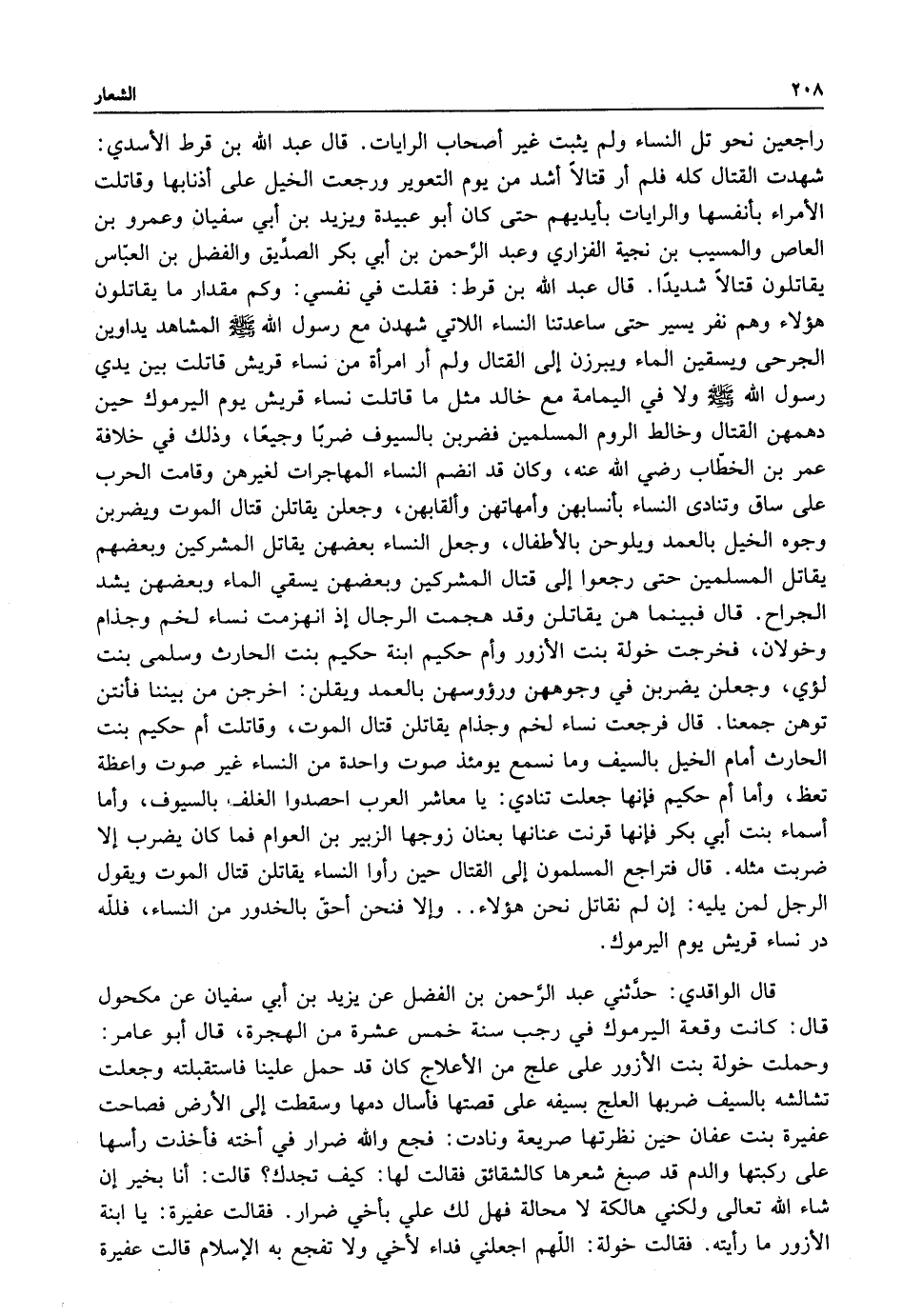 راجعين نحو تل النساء ولم يثبت غير أصحاب الرايات قال عبد الله بن قرط الاسدي شهدت القتال كله فلم أر قتالا أشد من يوم التعوير ورجعت الخيل على أذنابها وقاتلت الأمراء بأنفسها والرايات بأيديهم حتى كان أبو عبيدة ويزيد بن أبي سفيان وعمرو بن العاص والمسبب بن نجيبة الفزاري وعبد الرحمن بن أبي بكر الصديق والفضل بن العباس يقاتلون قتالا شديدا قال عبد الله بن قرط فقلت في نفسي: وكم مقدار ما يقاتلون هؤلاء وهم نفر يسير حتى ساعدتنا النساء اللاتي شهدن مع رسول الله صلى الله عليه وسلم المشاهد يداوين الجرحى ويسقين الماء ويبرزن إلى القتال ولم أر امرأة من نساء قريش قاتلت بين يدي رسول الله صلى الله عليه وسلم ولا في اليمامة مع خالد مثل ما قاتلت نساء قريش يوم اليرموك حين دهمهن القتال وخالط الروم المسلمين فضربن بالسيوف ضربا وجيعا وذلك في خلافة عمر بن الخطاب رضي الله عنه وكان قد انضم النساء المهاجرات لغيرهن وقامت الحرب على ساق وتنادى النساء بأنسابهن وأمهاتهن والقابهن وجعلن يقاتلن قتال الموت ويضربن وجوه الخيل بالعمد ويلوحن بالأطفال وجعل النساء بعضهن يقاتل المشركين وبعضهن يقاتل المسلمين حتى رجعوا إلى قتال المشركين وبعضهم يسقي الماء وبعضهن يشد الجراح قال فبينما هن يقاتلن وقد هجمت الرجال إذ انهزمت نساء لخم وجذام وخولان فخرجت خولة بنت الأزور وأم حكيم ابنه حكيم بنت الحرث وسلمى بنت لؤي وجعلهن يضربن في وجوههن ورؤوسهن بالعمد ويقلن اخرجن من بيننا فانتن توهن جمعنا قال فرجعت نساء لخم وجذام يقاتلن قتال الموت وقاتلت أم حكيم بنت الحرث أمام الخيل بالسيف وما نسمع يومئذ صوت واحدة من النساء غير صوت واعظة تعظ وأما أم حكيم فإنها جعلت تنادي يا معاشر العرب احصدوا الغلف بالسيوف وأما أسماء بنت ابي بكر فإنها قرنت عنانها بعنان زوجها الزبير ابن العوام فما كان يضرب إلا ضربت مثله قال فتراجع المسلمون إلى القتال حين رأوا النساء يقاتلن قتال الموت ويقول الرجل لمن يليه: أن لم نقاتل نحن هولاء وإلا فنحن أحق بالخدور من النساء فلله در نساء قريش يوم اليرموك.