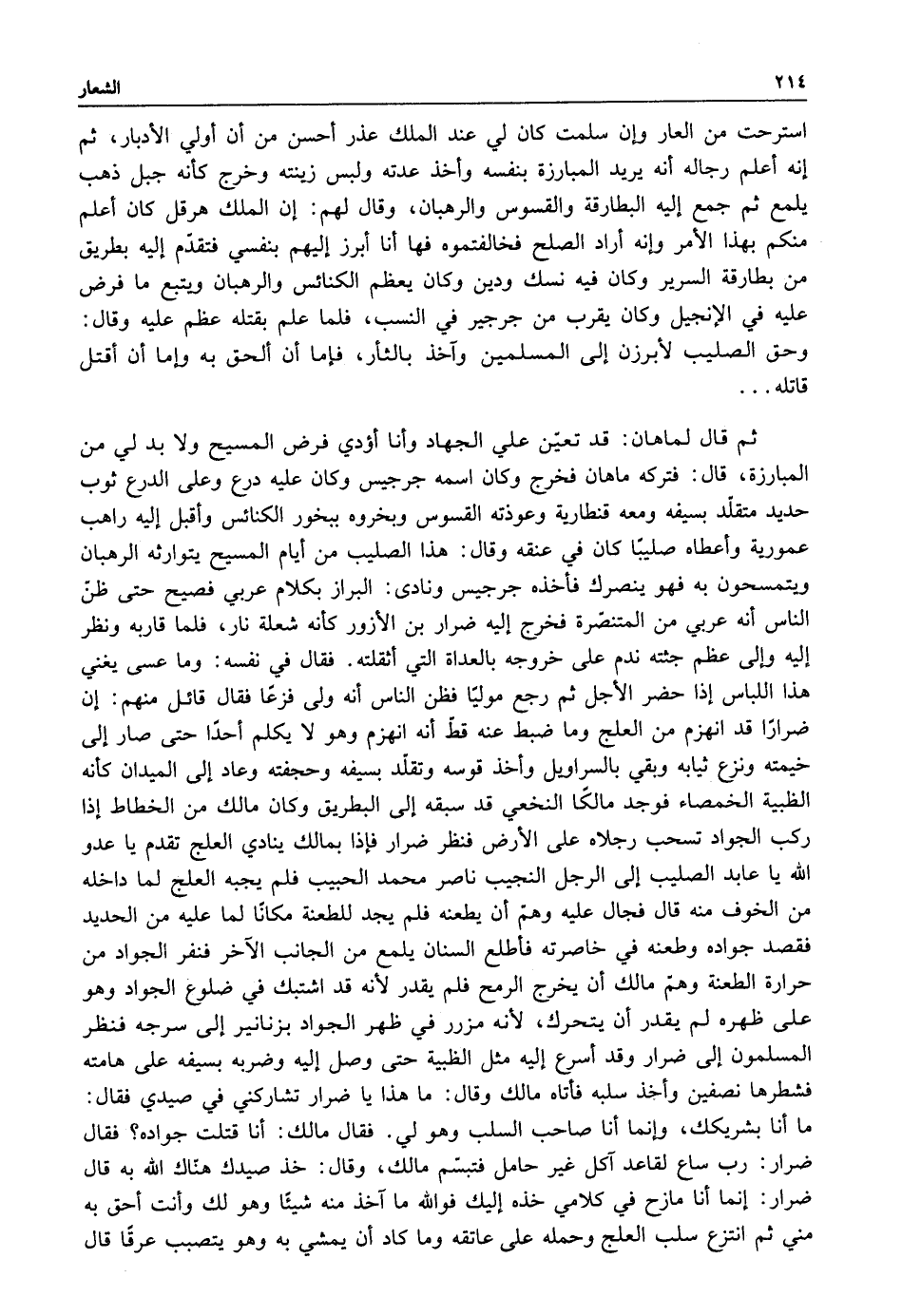 ثم قال ماهان قد تعين علي الجهاد وأنا أؤدي فرض المسيح ولا بد لي من المبارزة قال فتركه ماهان فخرج وكان أسمه جرجيس وكان عليه درع وعلى الدرع ثوب حديد متقلد بسيفه ومعه فنطارية وعوذته القسوس وبخروه ببخور الكنائس واقبل إليه راهب عمورية وأعطاه صليبا كان في عنقه وقال هذا الصليب من أيام المسيح يتوارثه الرهبان ويتمسحون به فهو ينصرك فأخذه جرجيس ونادى البراز بكلام عربي فصيح حتى ظن الناس إنه عربي من المتنصرة فخرج إليه ضرار بن الأزور كأنه شعلة نار فلما قاربه ونظر إليه والى عظم جثته ندم على خروجه بالعدة التي أثقلته فقال في نفسه وما عسى يغني هذا اللباس إذا حضر الأجل ثم رجع موليا فظن الناس إنه ولى فزعا فقال قائل منهم أن ضرار قد انهزم من العلج وما ضبط عنه قط إنه انهزم وهو لا يكلم أحدا حتى صار إلى خيمته ونزع ثيابه وبقي بالسراويل واخذ قوسه وتقلد بسيفه وجحفته وعاد إلى الميدان كأنه الظبية الخمصاء فوجد مالكا النخعي قد سبقه إلى البطريق وكان مالك من الخطاط إذا ركب الجواد تسحب رجلاه على الأرض فنظر ضرار فإذا بمالك ينادي العلج تقدم يا عدو الله يا عابد الصليب إلى الرجل النجيب ناصر محمد الحبيب فلم يجبه العلج لما داخله من الخوف منه قال: فجال عليه وهم أن يطعنه فلم يجد للطعنة مكانا لما عليه من الحديد فقصد جواده وطعنه في خاصرته فأطلع السنان يلمع من الجانب الآخر فنفر الجواد من حرارة الطعنة وهم مالك أن يخرج الرمح فلم يقدر لانه قد اشتبك في ضلوع الجواد وهو على ظهره لم يقدر أن يتحرك لانه مزرر في ظهر الجواد بزنانير إلى سرجه فنظر المسلمون إلى ضرار وقد أسرع إليه مثل الظبية حتى وصل إليه وضربه بسيفه على هامته فشطرها نصفين واخذ سلبه فأتاه مالك وقال: ما هذا يا ضرار تشاركني في صيدي فقال: ما أنا بشريكك وإنما أنا صاحب السلب وهو لي فقال مالك: أنا قتلت جواده فقال ضرار رب ساع لقاعد آكل غير حامل فتبسم مالك وقال خذ صيدك هناك الله به قال ضرار انما أنا مازح في كلامي خذه إليك فوالله ما أخذ منه شيئا وهو لك وأنت أحق به مني ثم انتزع سلب العلج وحمله على عاتقه وما كاد أن يمشي به وهو يتصبب عرقا قال