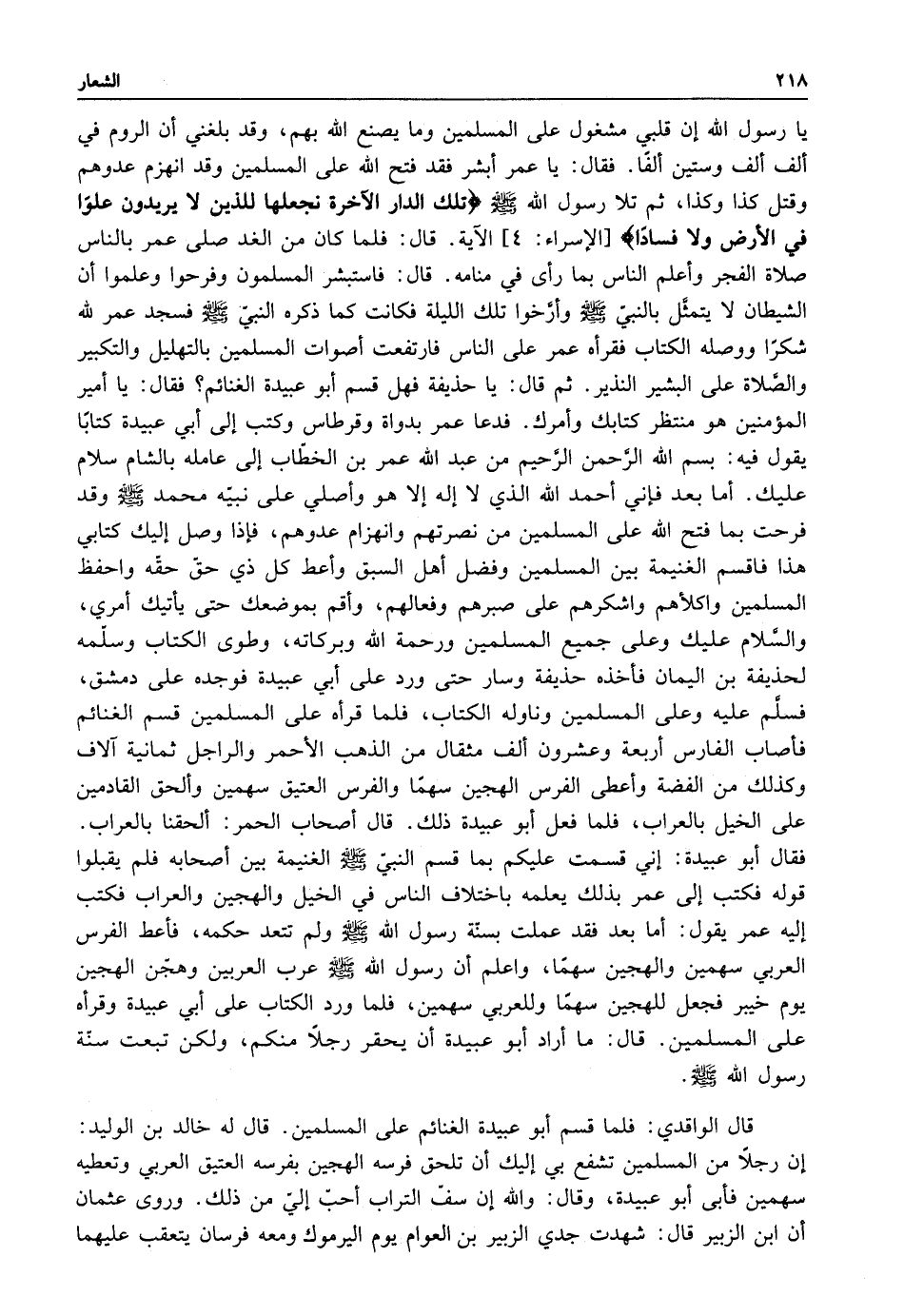 يا رسول الله أن قلبي مشغول على المسلمين وما يصنع الله بهم وقد بلغني أن الروم في ألف ألف وستين ألف فقال: يا عمر أبشر فقد فتح الله على المسلمين وقد انهزم عدوهم وقتل كذا وكذا ثم تلا رسول الله صلى الله عليه وسلم: {تِلْكَ الدَّارُ الْآخِرَةُ نَجْعَلُهَا لِلَّذِينَ لا يُرِيدُونَ عُلُوّاً فِي الْأَرْضِ وَلا فَسَاداً} [القصص: 83] الآية قال فلما كان من الغد صلى عمر بالناس صلاة الفجر وأعلم الناس بما رأى في منامه قال فاستبشر المسلمون وفرحوا وعلموا أن الشيطان لا يتمثل بالنبي صلى الله عليه وسلم وأرخوا تلك الليلة فكانت كما ذكره النبي صلى الله عليه وسلم فسجد عمر لله شكرا ووصله الكتاب فقرأه عمر على الناس فارتفعت أصوات المسلمين بالتهليل والتكبير والصلاة على البشير النذير ثم قال: يا حذيفة فهل قسم أبو عبيدة الغنائم فقال: يا أمير المؤمنين هو منتظر كتابك وأمرك فدعا عمر بدواة وقرطاس وكتب إلى أبي عبيدة كتابا يقول فيه: بسم الله الرحمن الرحيم من عبد الله عمر بن الخطاب إلى عامله بالشام سلام عليك أما بعد فاني أحمد الله الذي لا إله إلا هو وأصلي على نبيه محمد صلى الله عليه وسلم وقد فرحت بما فتح الله على المسلمين من نصرتهم وانهزام عدوهم فإذا وصل إليك كتابي هذا فاقسم الغنيمة بين المسلمين وفضل أهل السبق وأعط كل ذي حق حقه واحفظ المسلمين واكلأهم واشكرهم على صبرهم وفعالهم وأقم بموضعك حتى يأتيك أمري والسلام عليك وعلى جميع المسلمين ورحمة الله وبركاته وطوى الكتاب وسلمه لحذيفة ابن اليمان فأخذه حذيفة وسار حتى ورد على أبي عبيدة فوجده على دمشق فسلم عليه وعلى المسلمين وناوله الكتاب فلما قرأه على المسلمين قسم الغنائم فاصاب الفارس أربعة وعشرون ألف مثقال من الذهب الأحمر والراجل ثمانية آلاف وكذلك من الفضة وأعطى الفرس الهجين سهما والفرس العتيق سهمين وألحق القادمين على الخيل بالعراب فلما فعل أبو عبيدة ذلك قال أصحاب الحمر الحقنا بالعراب فقال أبو عبيدة: إني قسمت عليكم بما قسم النبي صلى الله عليه وسلم الغنيمة بين أصحابه فلم يقبلوا قوله فكتب إلى عمر بذلك يعلمه باختلاف الناس في الخيل والهجين والعراب فكتب إليه عمر يقول: أما بعد فقد عملت بسنة رسول الله صلى الله عليه وسلم ولم تتعد حكمه فاعظ الفرس العربي سهمين والهجين سهما واعلم أن رسول الله صلى الله عليه وسلم عرب العربين وهجن الهجين يوم خيبر فجعل للهجين سهما وللعربي سهمين فلما ورد الكتاب على أبي عبيدة وقرأه على المسلمين قال: ما أراد أبو عبيدة أن يحقر رجلا منكم ولكن تبعت سنة رسول الله صلى الله عليه وسلم.