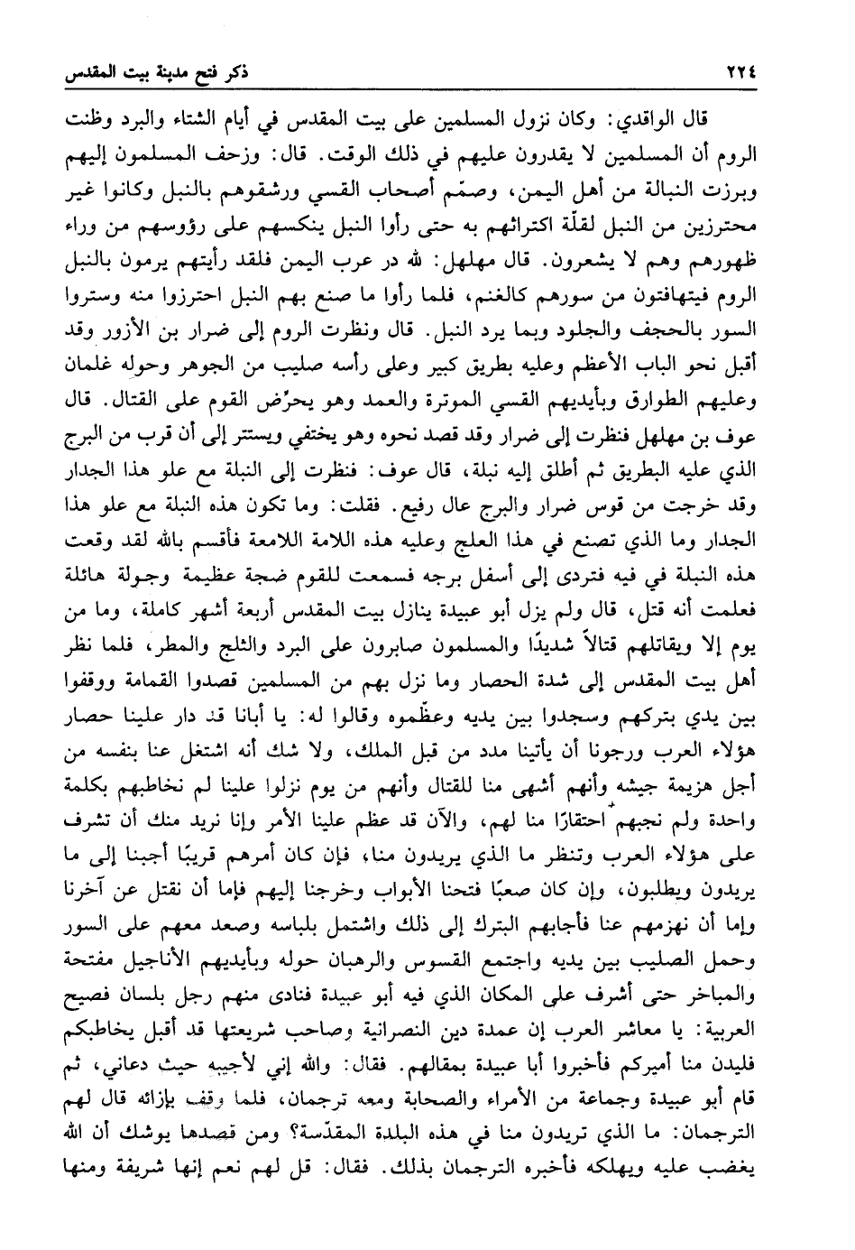 قال الواقدي: وكان نزول المسلمين على بيت المقدس في أيام الشتاء والبرد وظنت الروم أن المسلمين لا يقدرون عليهم في ذلك الوقت قال: وزحف المسلمون إليهم وبرزت النبالة من أهل اليمن وصمم أصحاب القسي ورشقوهم بالنبل وكانوا غير محترزين من النبل لقلة أكتراثهم به حتى رأوا النبل ينكسهم على رؤوسهم من وراء ظهورهم وهم لا يشعرون قال مهلهل لله در عرب اليمن فلقد رأيتهم يرمون بالنبل الروم فيتهافتون من سورهم كالغنم فلما رأوا ما صنع بهم النبل احترزوا منه وستروا السور بالحجف والجلود وبما يرد النبل قال ونظرت الروم إلى ضرار بن الأزور وقد اقبل نحو الباب الأعظم وعليه بطريق كبير وعلى رأسه صليب من الجوهر وحوله غلمان وعليهم الطوارق وبأيديهم القسي الموترة والعمد وهو يحرص القوم على القتال قال عوف بن مهلهل إلى ضرار وقد قصد نحوه وهو يختفي ويستتر إلى أن قرب من البرج الذي عليه البطريق ثم أطلق إليه نبلة قال عوف فنظرت الىالنبلة مع علو هذا الجدار وقد خرجت من قوس ضرار والبرج عال رفيع فقلت: وما تكون هذه النبلة مع علو هذا الجدار وما الذي تصنع في هذا العلج وعليه هذه اللامة اللامعة فاقسم بالله لقد وقعت هذه النبلة في فيه فتردى إلى أسفل برجة فسمعت للقوم ضجة عظيمة ورجولة هائلة فعلمت إنه قتل قال ولم يزل أبو عبيدة ينازل بيت المقدس أربعة أشهر كاملة وما من يوم إلا ويقاتلهم قتالا شديدا والمسلمون صابرون على البرد والثلج والمطر فلما نظر أهل بيت المقدس إلى شدة الحصار وما نزل بهم من المسلمين قصدوا القمامة ووقفوا بين يدي بتركهم وسجدوا بين يديه وعظموه وقالوا له: يا ابانا قد دار علينا حصار هؤلاء العرب ورجونا أن يأتينا مدد من قبل الملك ولا شك إنه اشتغل عنا بنفسه من أجل هزيمة جيشه وإنهم أشهى منا للقتال وإنهم من يوم نزلوا علينا لم نخاطبهم بكلمة واحدة ولم نجبهم احتقارا منا لهم والآن قد عظم علينا الأمر وأنا نريد منك أن تشرف على هؤلاء العرب وتنظر ما الذي يريدون منا فإن كان أمرهم قريبا أجبنا إلى ما يريدون ويطلبون وأن كان صعبا فتحنا الأبواب وخرجنا إليهم فاما أن نقتل عن آخرنا واما أن نهزمهم عنا فأجابهم البترك إلى ذلك واشتمل بلباسه وصعد معهم على السور وحمل الصليب بين يديه واجتمع القسوس والرهبان حوله وبايديهم الأناجيل مفتحة والمباخر حتى اشرف على المكان الذي فيه أبو عبيدة فنادى منهم رجل بلسان فصيح العربية يا معاشر العرب أن عمدة دين النصرانية وصاحب شريعتها قد أقبل يخاطبكم فليدن منا أميركم فأخبروا أبا عبيدة بمقالهم فقال والله إني لاجيبه حيث دعاني ثم قام أبو عبيدة وجماعة من الأمراء والصحابة ومعه ترجمان فلما وقف بازائه قال لهم الترجمان: ما الذي تريدون منا في هذه البلدة المقدسة ومن قصدها يوشك أن الله يغضب عليه ويهلكه فأخبره الترجمان بذلك فقال قل لهم: نعم إنها شريفة ومنها