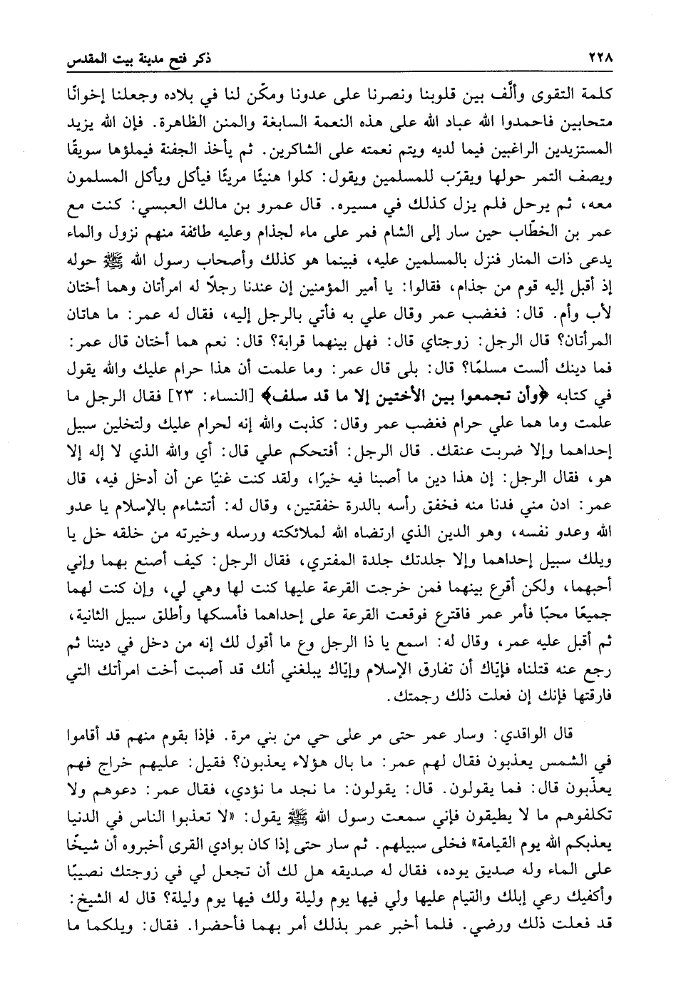 كلمة التقوى وألف بين قلوبنا ونصرنا على عدونا ومكن لنا في بلاده وجعلنا اخوانا متحابين فاحمدوا الله عباد الله على هذه النعمة السابغة والمنن الظاهرة فإن الله يزيد المستزيدين الراغبين فيما لديه ويتم نعمته على الشاكرين ثم يأخذ الجفنة فيملؤها سويقا ويصف التمر حولها ويقرب للمسلمين ويقول: كلوا هنيئا مريئا فياكل ويأكل المسلمون معه ثم يرحل فلم يزل كذلك في مسيره قال عمرو بن مالك العبسي كنت مع عمر بن الخطاب حين سار إلى الشام فمر على ماء لجذام وعليه طائفة منهم نزول والماء يدعى ذات المنار فنزل بالمسلمين عليه فبينما هو كذلك وأصحاب رسول الله صلى الله عليه وسلم حوله إذ أقبل إليه قوم من جذام فقالوا: يا أمير المؤمنين أن عندنا رجلا له أمرأتان وهما أختان لاب وأم قال فغضب عمر وقال علي به فاتى بالرجل إليه فقال له عمر: ما هاتان المرأتان قال الرجل زوجتاي قال فهل بينهما قرابة قال: نعم هما اختان قال عمر فما دينك ألست مسلما قال بلى قال عمر وما علمت أن هذا حرام عليك والله يقول في كتابه: {وَأَنْ تَجْمَعُوا بَيْنَ الْأُخْتَيْنِ إِلَّا مَا قَدْ سَلَفَ} [النساء: 23] فقال الرجل ما علمت وما هما علي حرام فغضب عمر وقال كذبت والله إنه لحرام عليك ولتخلين سبيل أحداهما وإلا ضربت عنقك قال الرجل افتحكم علي قال: أي والله الذي لا إله إلا هو فقال الرجل أن هذادين ما اصبنا فيه خيرا ولقد كنت غنيا عن أن أدخل فيه قال عمر ادن مني فدنا منه فخفق راسه بالدرة خفقتين وقال له: أتتشاءم بالإسلام يا عدو الله وعدو نفسه وهو الدين الذي ارتضاه الله لملائكته ورسله وخيرته من خلقه خل يا ويلك سبيل أحداهما وإلا جلدتك جلدة المفثري فقال الرجل كيف اصنع بهما وإني أحبهما ولكن اقرع بينهما فمن خرجت القرعة عليها كنت لها وهي لي وأن كنت لهما جميعا محبا فأمر عمر فاقترع فوقعت القرعة على أحداهما فأمسكها وأطلق سبيل الثانية ثم أقبل عليه عمر وقال له: اسمع يا ذا الرجل وع ما أقول لك إنه من دخل في ديننا ثم رجع عنه قتلناه فإياك أن تفارق الإسلام وإياك يبلغني أن قد اصبت أخت أمرأتك التي فارقتها فانك أن فعلت ذلك رجمتك.