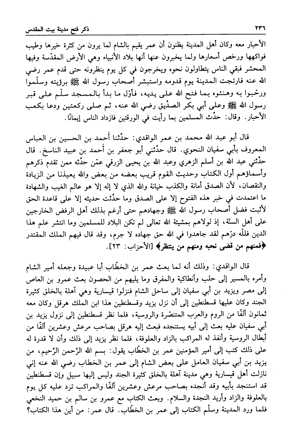 قال أبو عبد الله محمد بن عمر الواقدي حدثنا أحمد بن الحسين بن العباس المعروف بأبي سفيان النحوي قال حدثنا أبو جعفر بن أحمد بن عبيد الناسخ قال حدثني عبد الله بن أسلم الزهري وعبد الله بن يحيى الزرقي عمن حدثه ممن تقدم ذكرهم واسماؤهم أول الكتاب وحديث القوم قريب بعضه من بعض والله يعيذنا من الزيادة والنقصان لأن الصدق أمانة والكذب خيانة والله الذي لا إله إلا هو عالم الغيب والشهادة ما اعتمدت في خبر هذه الفتوح إلا على الصدق وما حدثت حديثه إلا على قاعدة الحق لاثبت فضل أصحاب رسول الله صلى الله عليه وسلم وجهادهم حتى أرغم بذلك أهل الرفض الخارجين على أهل السنة إذ لولاهم بمشيئتة الله تعالى لم تكن البلاد للمسلمين وما انتشر علم هذا الدين فلله درهم لقد جاهدوا في الله حق جهاده لا جرم وقد قال فيهم الملك المقتدر: {فَمِنْهُمْ مَنْ قَضَى نَحْبَهُ وَمِنْهُمْ مَنْ يَنْتَظِرُ} [الأحزاب: 23] .