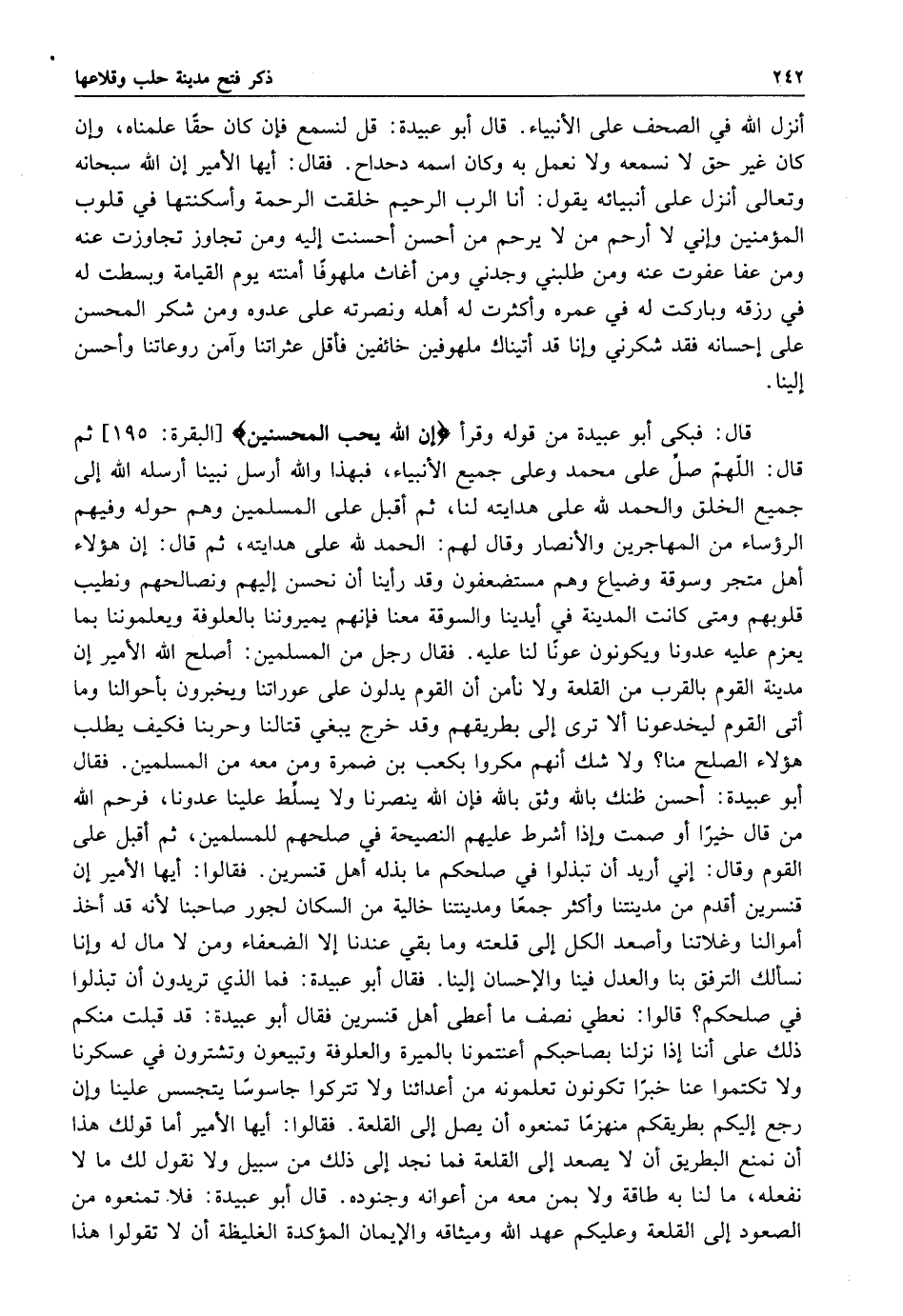 قال فبكى أبو عبيدة من قوله وقرأ: {إِنَّ اللَّهَ يُحِبُّ الْمُحْسِنِينَ} [البقرة: 195] ثم قال اللهم صل على محمد وعلى جميع الأنبياء فبهذا والله أرسل نبينا أرسله الله إلى جميع الخلق والحمد لله على هدايته لنا ثم أقبل على المسلمين وهم حوله وفيهم الرؤساء من المهاجرين والأنصار وقال لهم: الحمد لله على هدايته ثم قال أن هؤلاء أهل متجر وسوقة وضياع وهم مستضعفون وقد رأينا أن نحسن إليهم ونصالحهم ونطيب قلوبهم ومتى كانت المدينة في أيدينا والسوقة معنا فانهم يميروننا بالعلوفة ويعلموننا بما يعزم عليه عدونا ويكونون عونا لنا عليه فقال رجل من المسلمين أصلح الله الأمير أن مدنية القوم بالقرب من القلعة ولا نأمن أن القوم يدلون على عوراتنا ويخبرون بأحوالنا وما أنى القوم ليخدعونا إلا ترى إلى بطريقهم وقد خرج يبغي قتالنا وحربنا فكيف يطلب هؤلاء الصلح منا ولا شك إنهم مكروا بكعب بن ضمرة ومن معه من المسلمين فقال أبو عبيدة: أحسن ظنك بالله وثق بالله فإن الله ينصرنا ولا يسلط علينا عدونا فرحم الله من قال خيرا أو صمت وإذا أشرط عليهم النصيحة في صلحهم للمسلمين ثم اقبل على القوم وقال إني أريد أن تبذلوا في صلحكم ما بذله أهل قنسرين 2 فقالوا: أيها الأمير أن قنسرين اقدم من مدينتنا وأكثر جمعا ومدينتنا خالية من السكان لجور صاحبنا لانه قد أخذ أموالنا وغلاتنا وأصعد الكل إلى قلعته وما بقي عندنا إلا الضعفاء ومن لا ماله له وأنا نسألك الترفق بنا والعدل فينا والأحسان إلينا فقال أبو عبيدة: فما الذي تريدون أن تبذلوا في صلحكم قالوا: نعطي نصف ما أعطى أهل قنسرين فقال أبو عبيدة: قد قبلت منكم ذلك على أننا إذا نزلنا بصاحبكم اعنتمونا بالميرة والعلوفة وتبيعون وتشترون في عسكرنا ولا تكتموا عنا خبرا تكونون تعلمونه من أعدائنا ولا تتركوا جاسوسا يتجسس علينا وأن رجع إليكم بطريقكم منهزما تمنعوه أن يصل إلى القلعة فقالوا: أيها الأمير أما قولك هذا أن نمنع البطريق أن لا يصعد إلى القلعة فما نجد إلى ذلك من سبيل ولا نقول لك ما لا نفعله ما لنا به طاقة ولا بمن معه من أعوانه وجندوه قال أبو عبيدة: فلا تمنعوه من الصعود إلى القلعة وعليكم عهد الله وميثاقه والإيمان المؤكدة الغليظة أن لا تقولوا: هذا