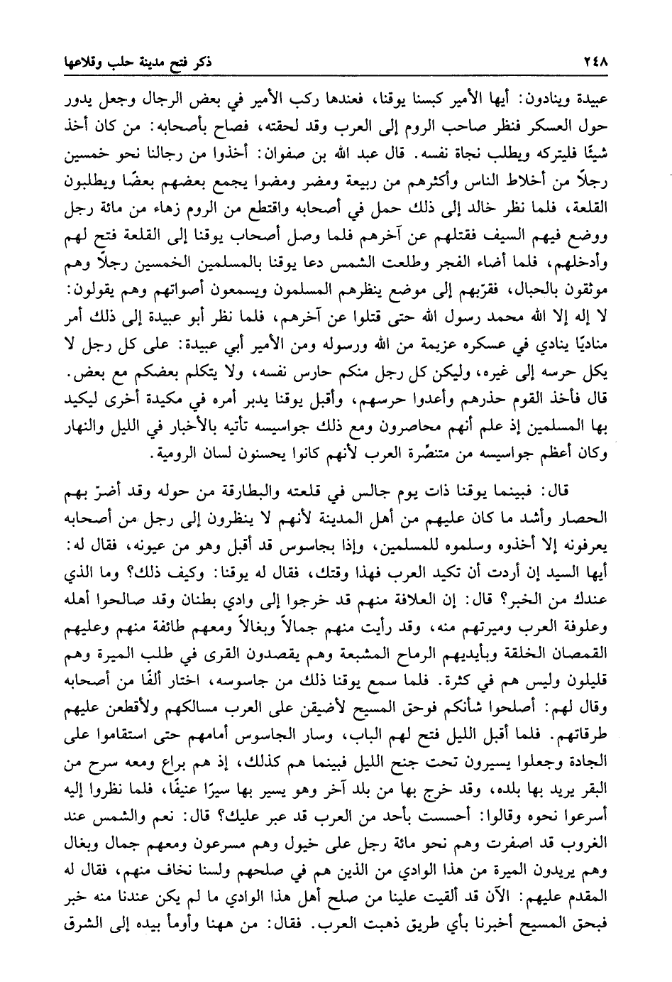 عبيدة وينادون أيها الأمير كبسنا يوقنا فعندها ركب الأمير في بعض الرجال وجعل يدور حول العسكر فنظر صاحب الروم إلى العرب وقد لحقته فصاح بأصحابه من كان أخذ شيئا فليتركه ويطلب نجاة نفسه قال عبد الله بن صفوان أخذوا من رجالنا نحو خمسين رجلا من أخلاط الناس واكثرهم من ربيعة ومضر ومضوا يجمع بعضهم بعضا ويطلبون القلعة فلما نظر خالد إلى ذلك حمل في أصحابه واقتطع من الروم زهاء من مائة رجل ووضع فيهم السيف فقتلهم عن آخرهم فلما وصل أصحاب يوقنا إلى القلعة فتح لهم وأدخلهم فلما أضاء الفجر وطلعت الشمس دعا يوقنا بالمسلمين الخمسين رجلا وهم موثقون بالحبال فقربهم إلى موضع ينظرهم المسلمون ويسمعون اصواتهم وهم يقولون لا إله إلا الله محمد رسول الله حتى قتلوا عن آخرهم فلما نظر أبو عبيدة إلى ذلك أمر مناديا ينادي في عسكره عزيمة من الله ورسوله ومن الأمير أبي عبيدة على كل رجل لا يكل حرسه إلى غيره ولكن كل رجل منكم حارس نفسه ولا يتكلم بعضكم مع بعض قال فأخذ القوم حذرهم وأعدوا حرسهم وأقبل يوقنا يدبر أمره في مكيدة أخرى ليكيد بها المسلمين إذ علم إنهم محاصرون ومع ذلك جواسيسه تأتيه بالأخبار في الليل والنهار وكان أعظم جواسيسه من متنصرة العرب لأنهم كانوا يحسنون لسان الرومية.