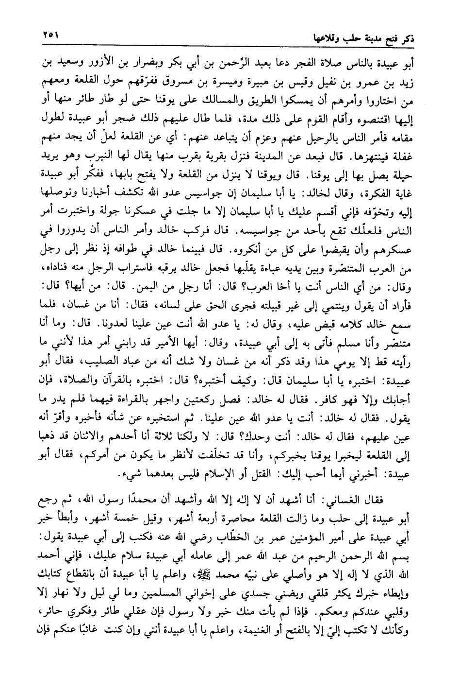 فقال أبو عبيدة: أخبرني أيما أحب إليك القتل أو الإسلام فليس بعدهما شيء فقال الغساني أنا أشهد أن لا إله إلا الله وأشهد أن محمدا رسول الله ثم رجع أبو عبيدة إلى حلب وما زالت القلعة محاصرة أربعة أشهر وقيل خمسة اشهر وابطأ خبر أبي عبيدة على أمير المؤمنين عمر بن الخطاب رضي الله عنه فكتب إلى ابي عبيدة يقول: بسم الله الرحمن الرحيم من عبد الله عمر إلى عامله أبي عبيدة سلام عليك فاني أحمد الله الذي لا إله إلا هو واصلي على نبيه محمد صلى الله عليه وسلم واعلم يا أبا عبيدة أن بانقطاع كتابك وابطاء خبرك يكثر قلقي ويضني جسدي على إخواني المسلمين وما لي ليل ولا نهار إلا وقلبي عندكم ومعكم فإذا لم يأت منك خبر ولا رسول فإن عقلي طائر وفكري حائر وكأنك لا تكتب الي إلا بالفتح أو الغنيمة واعلم يا أبا عبيدة أنني وأن غائبا عنكم فإن