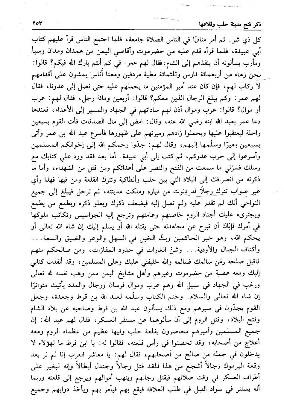 كل ذي شر ثم أمر مناديا في الناس الصلاة جامعة فلما اجتمع الناس قرا عليهم كتاب أبي عبيدة فلما قرأه قدم عليه من حضرموت واقاصي اليمن من همدان ومدان وسبا ومارب يسألونه أن ينفذهم إلى الشام فقال لهم عمر: في كم أنتم بارك الله فيكم قالوا: نحن زهاء من أربعمائة فارس وثلثمائة مطية مردفين ومعنا أناس يمشون على أقدامهم لا ركاب لهم فإن كان عند أمير المؤمنين ما يحملهم عليه حتى نصل إلى عدونا فقال لهم عمر: وكم يبلغ الرجال الذين معكم قالوا: أربعين ومائة رجل فقال لهم: عرب أو موال قالوا: عرب وموال أذن لهم ساداتهم في الجهاد والمسير إلى الأعداء فعندها دعا عمر بعبد الله ابنه رضي الله عنه وقال أمض إلى مال الصدقات فأت القوم بسبعين راحلة ليعتقبوا عليها ويحملوا زادهم وميرتهم على ظهورها فأسرع عبد الله بن عمر وأتى بسبعين بعيرا وسلمها إليهم وقال لهم: جدوا رحمكم الله إلى اخوانكم المسلمين واسرعوا إلى حرب عدوكم ثم كتب إلى ابي عبيدة أما بعد فقد ورد علي كتابك مع رسلك فسرني ما سمعت من الفتح والنصر على اعدائكم ومن قتل من الشهداء وأما ما ذكرته من انصرافك إلى البلاد التي بين حلب وانطاكية وتترك القلعة ومن فيها فهذا رأي غير صواب تترك رجلا قد دنوت من دياره وملكت مدينته ثم ترحل فيبلغ إلى جميع النواحي إنك لم تقدر عليه ولم تصل إليه فيضعف ذكرك ويعلو ذكره ويطمع من يطمع ويجترىء عليك أجناد الروم خاصتهم وعامتهم وترجع إليه الجواسيس وتكاتب ملوكها في أمرك فإياك أن تبرح عن مجاهدته حتى يقتله الله او يسلم إليك أن شاء الله تعالى أو يحكم الله وهو خير الحاكمين وبث الخيل في السهل والوعر والضيق والسعة وأكناف الجبال والأودية وشن الغارات في حدود المفازات ومن صالحكم منهم فاقبل صلحه ومن سالمك فسالمه والله خليفتي عليك وعلى المسلمين وقد انقذت كتابي إليك ومعه عصبة من حضرموت وغيرهم وأهل مشايخ اليمن ممن وهب نفسه لله تعالى ورغب في الجهاد في سبيل الله وهم عرب وموال فرسان ورجال والمدد يأتيك متواترا أن شاء الله تعالى والسلام وختم الكتاب وسلمه لعبد الله بن قرط وجعدة وجعل القوم يجدون في سيرهم ومع ذلك يسألون عبد الله بن قرط وصاحبه عن بلاد الشام وفتح البلاد وقتل الروم إلى أن سألوهما عن مستقر العسكر فقال لهم عبد الله: أن جميع المسلمين وأميرهم محاصرون بقلعة حلب وفيها عظيم من عظماء الروم ومعه أعلاج من أصحابه وقد تحصنوا في رأس قلعته فقالوا له: يا ابن قرط ما لهؤلاء لا يدخلون في جملة من صالح من أصحابهم فقال لهم: يا معاشر العرب أنا لم نر بعد وقعة اليرموك رجالا أشجع من هذا فلقد قتل رجالا وجندل أبطالا وأنه ليغير على أطراف العسكر في وقت صلاتهم فيقتل رجالهم وينهب أموالهم ويرجع إلى قلعته وربما إنه يستتر في سواد الليل في طلب العلافة فيقع بهم فيأمر بهم ويأخذ دوابهم وجميع.