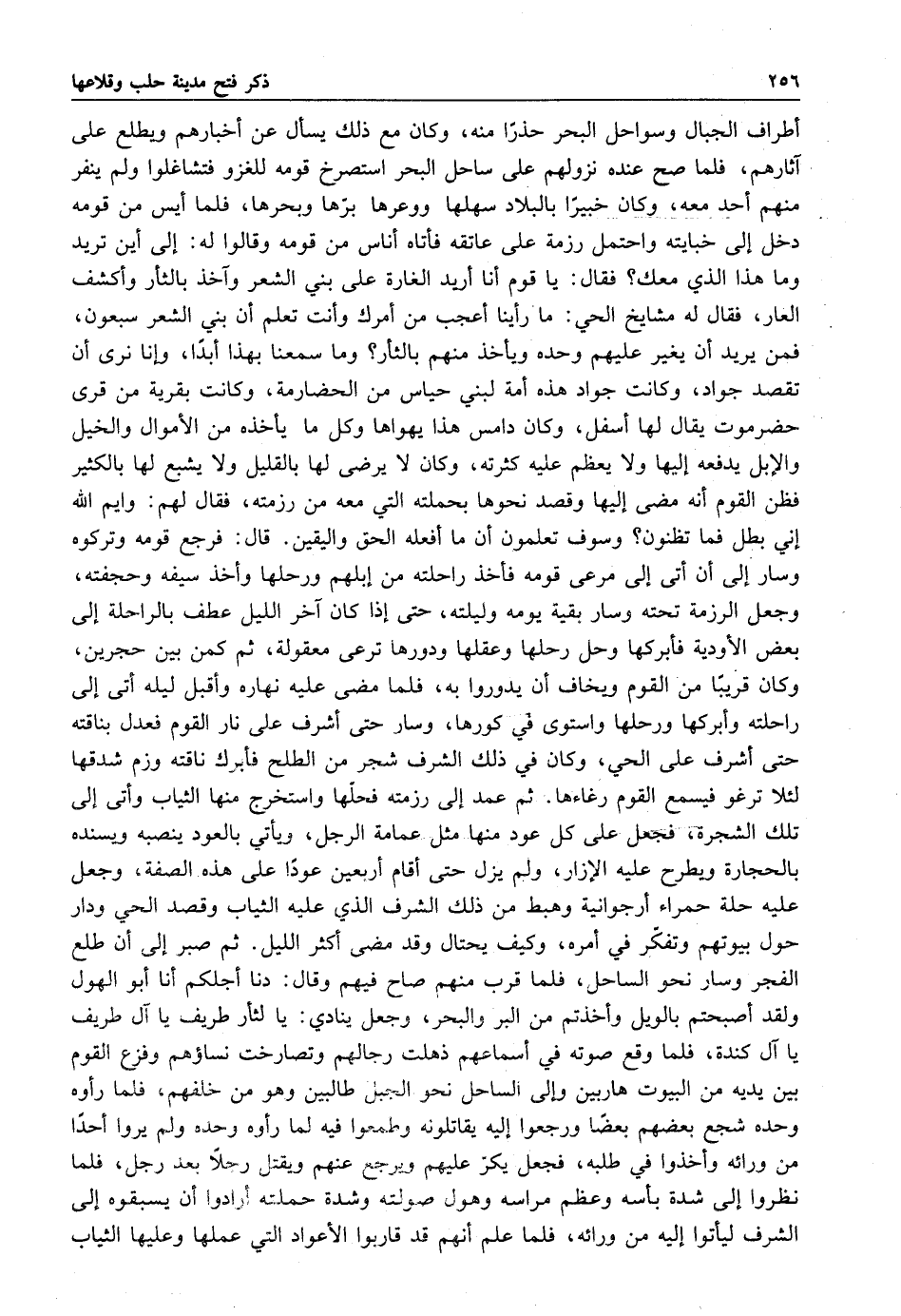 أطراف الجبال وسواحل البحر حذرا منه وكان مع ذلك يسال عن أخبارهم ويطلع على آثارهم فلما اصبح عند نزولهم على ساحل البحر استصرخ قومه للغزو فتشاغلوا ولم ينفر منهم أحد معه وكان خبيرا بالبلاد سهلها ووعرها برها وبحرها فلما ايس من قومه دخل إلى خبايته واحتمل رزمة على عاتقه فأتاه اناس من قومه وقالوا له: إلى اين تريد وما هذا الذي معك فقال: يا قوم أنا أريد الغارة على بني الشعر وآخذ بالثار واكشف العار فقال له مشايخ الحي: ما رأينا أعجب من أمرك وأنت تعلم أن بني الشعر سبعون فمن يريد أن يغير عليهم وحده ويأخذ منهم بالثأر وما سمعنا بهذا ابدا وأنا نرى أن تقصد جواد وكانت جواد هذه امة لبني حياس من الحضارمة وكانت بقرية من قرى حضرموت يقال لها: أسفل وكان دامس هذا يهواها وكل ما يأخذه من الأموال والخيل والإبل يدفعه إليها ولا يعظم عليه كثرته وكان لا يرضى لها بالقليل ولا يشبع لها بالكثير فظن القوم إنه مضى إليها وقصد نحوها بحملته التي معه من رزمته فقال لهم: وايم الله إني بطل فما تظنون وسوف تعلمون أن ما أفعله الحق واليقين قال فرجع قومه وتركوه وسار إلى أن أتى إلى مرعى قومه فأخذ راحلته من ابلهم ورحلها واخذ سيفه وحجفته وجعل الرزمة تحته وسار بقية يومه وليلته حتى إذ كان آخر الليل عطف بالراحلة إلى بعض الأودية فأبركها وحل رحلها وعقلها ودورها ترعى معقولة ثم كمن بين حجرين وكان قريبا من القوم ويخاف أن يدوروا به فلما مضى عليه نهاره واقبل ليله أتى إلى راحلته وأبركها ورحلها واستوى في كورها وسار حتى اشرف على نار القوم فعدل بناقته حتى اشرف على الحي وكان في ذلك الشرف شجر من الطلح فأبرك ناقته وزم شدقها لئلا ترغو فيسمع القوم رغاءها ثم عمد إلى رزمته فحلها واستخرج منها الثياب واتى إلى تلك الشجرة فجعل على كل عود منها مثل عمامة الرجل ويأتي بالعود ينصبه ويسنده بالحجارة ويطرح عليه الأزار ولم يزل حتى أقام أربعين عودا على هذه الصفة وجعل عليه حلة حمراء أرجوانية وهبط من ذلك الشرف الذي عليه الثياب وقصد الحي ودار حول بيوتهم وتفكر في أمره وكيف يحتال وقد مضى أكثر الليل ثم صبر إلى أن طلع الفجر وسار نحو الساحل فلما قرب منهم صاح فيهم وقال دنا أجلكم أنا أبو الهول ولقد أصبحتم بالويل وأخذتم من البر والبحر وجعل ينادي يا لثار طريف يا آل طريف يا آل كندة فلما وقع صوته في أسماعهم ذهلت رجالهم وتصارخت نساؤهم وفزع القوم بين يديه من البيوت هاربين والى الساحل نحو الجبل طالبين وهو من خلفهم فلما رأوه وحده شجع بعضهم بعضا ورجعوا إليه يقاتلونه وطمعوا فيه لما رأوه وحده ولم يروا أحدا من ورائه وأخذوا في طلبه فجعل يكر عليهم ويرجع عنهم ويقتل رجلا بعد رجل فلما نظروا إلى شدة بأسه وعظم مراسه وهول صولته وشدة حملته أرادوا أن يسبقوه إلى الشرف ليأتوا إليه من ورائه فلما علم إنهم قد قاربوا الأعواد التي عملها وعليها الثياب