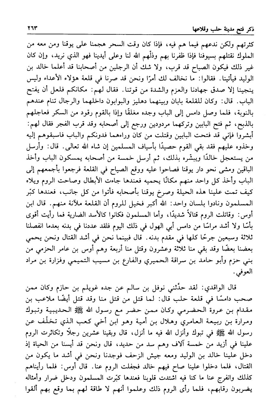 قال الواقدي: لقد حدثني نوفل بن سالم عن جده غويلم بن حازم وكان ممن صحب دامسا في قلعة حلب قال لما قتل من قتل منا وقد قتل أيضا ملاعب بن مقدام بن عروة الحضرمي وكان ممن حضر مع رسول الله صلى الله عليه وسلم الحديبية وتبوك ومرارة بن ربيعة العامري وهلال بن أمية وهو ابن أخي كعب الذي تخلف عن رسول الله صلى الله عليه وسلم في تبوك وأنزل الله فيه ما أنزل قال: وبقينا عشرين رجلا وتكاثرت الروم علينا في أزيد من خمسة آلاف وهم سد من حديد قال: ونحن قد أيسنا من الحياة إذ دخل علينا خالد بن الوليد ومعه جيش الزحف فوجدنا ونحن في أشد ما يكون من القتال فلما دخلوا علينا صاح فيهم خالد فجفلت الروم عنا قال أوس فلما رأيناهم كذلك وانفرج عنا ما كنا فيه اشتدت قلوبنا فعندها كبرت المسلمون ودخل ضرار وأمثاله يضربون رقابهم فلما رأى الروم ذلك وعلموا إنهم لا طاقة لهم بما وقع بهم ألقوا