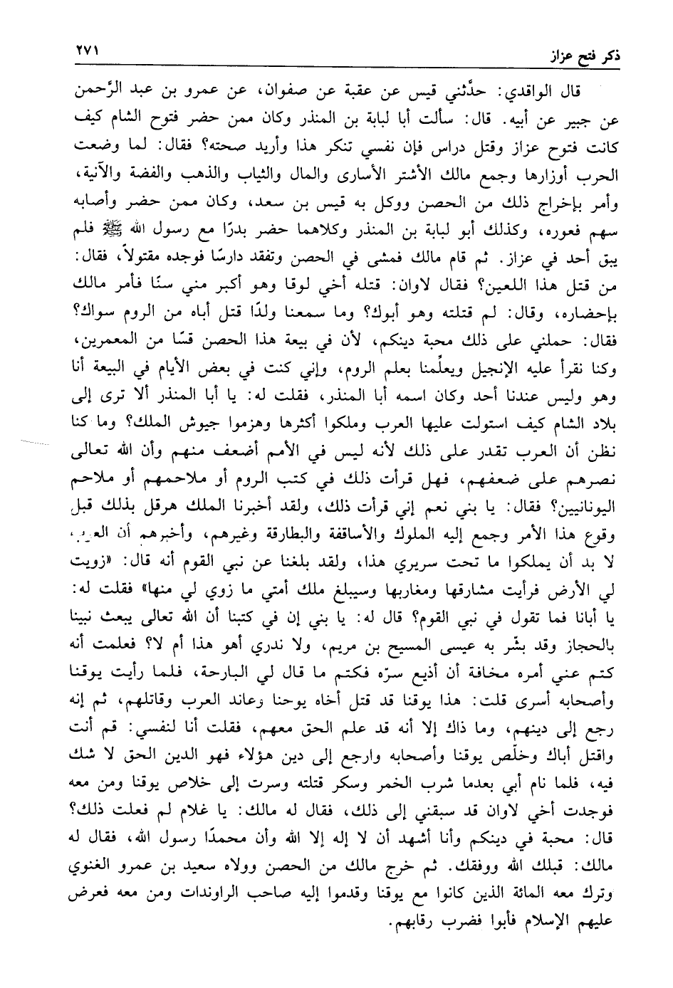 قال الواقدي: حدثني قيس عن عقبة عن صفوان عن عمرو بن عبد الرحمن عن جبير عن أبيه قال سألت أبا لبابة بن المنذر وكان ممن حضر فتوح الشام كيف كانت فتوح عزاز وقتل دراس فإن نفسي تنكر هذا وأريد صحته فقال لما وضعت الحرب أوزارها وجمع مالك الاشتر الاسارى والمال والثياب والذهب والفضة والآنية وأمر باخراج ذلك من الحصن ووكل به قيس بن سعد وكان ممن حضر وأصابه سهم فعوره وكذلك أبو لبابة بن المنذر وكلاهما حضر بدرا مع رسول الله صلى الله عليه وسلم فلم يبق أحد في عزاز ثم قام مالك فمشى في الحصن وتقعد دراسا فوجده مقتولا فقال من قتل هذا اللعين فقال لاوان: قتله أخي لوقا وهو أكبر مني سنا فأمر مالك باحضاره وقال لم قتلته وهو أبوك وما سمعنا ولدا قتل أباه من الروم سواك فقال حملني على ذلك محبة دينكم لأن في بيعة هذا الحصن قسا من المعمرين وكنأ نقرأ عليه الإنجيل ويعلمنا بعلم الروم وإني كنت في بعض الايام في البيعة أنا وهو وليس عندنا أحد وكان اسمه أبا المنذر فقلت له: يا أبا المنذر إلا ترى إلى بلاد الشام كيف استولت عليها العرب وملكوا أكثرها وهزموا جيوش الملك وما كنا نظن أن العرب تقدر على ذلك لانه ليس في الأمم أضعف منهم وأن الله تعالى نصرهم على ضعفهم فهل قرأت ذلك في كتب الروم أو ملاحمهم أو ملاحم اليونانيين فقال: يا بني نعم إني قرأت ذلك ولقد أخبرنا الملك هرقل بذلك قبل وقوع هذا الأمر وجمع إليه الملوك والاساقفه والبطارقة وغيرهم وأخبرهم أن العرب لا بد أن يملكوا ما تحت سريري هذا ولقد بلغنا عن نبي القوم إنه قال زويت لي الأرض فرأيت مشارقها ومغاربها وسيبلغ ملك أمتي ما زوى لي منها فقلت له: يا أبانا فما تقول في نبي القوم قال له: يا بني أن في كتبنا أن الله تعالى يبعث نبيا بالحجاز وقد بشر به عيسى المسيح بن مريم ولا ندري أهو هذا أم لا فعلمت إنه كتم عني امره مخافة أن اذيع سره فكتمت ما قال لي البارحة فلما رأيت يوقنا وأصحابه اسرى قلت: هذا يوقنا قد قتل أخاه يوحنا وعاند العرب وقاتلهم ثم إنه رجع إلى دينهم وما ذاك إلا إنه قد علم الحق معهم فقلت: أنا لنفسي قم أنت واقتل أباك وخلص يوقنا وأصحابه وارجع إلى دين هؤلاء فهو الدين الحق لا شك فيه فلما نام ابي بعدما شرب الخمر وسكر قتلته وسرت إلى خلاص يوقنا ومن معه فوجدت أخي لاوان قد سبقني إلى ذلك فقال له مالك: يا غلام لم فعلت ذلك قال: محبة في دينكم وأنا أشهد أن لا إله إلا الله وأن محمدا رسول الله فقال له مالك: قبلك الله ووفقك ثم خرج مالك من الحصن وولاه سعيد بن عمرو الغنوي وترك معه المائة الذين كانوا مع يوقنا وقدموا إليه صاحب الراوندات ومن معه فعرض عليهم الإسلام فابوا فضرب رقابهم.