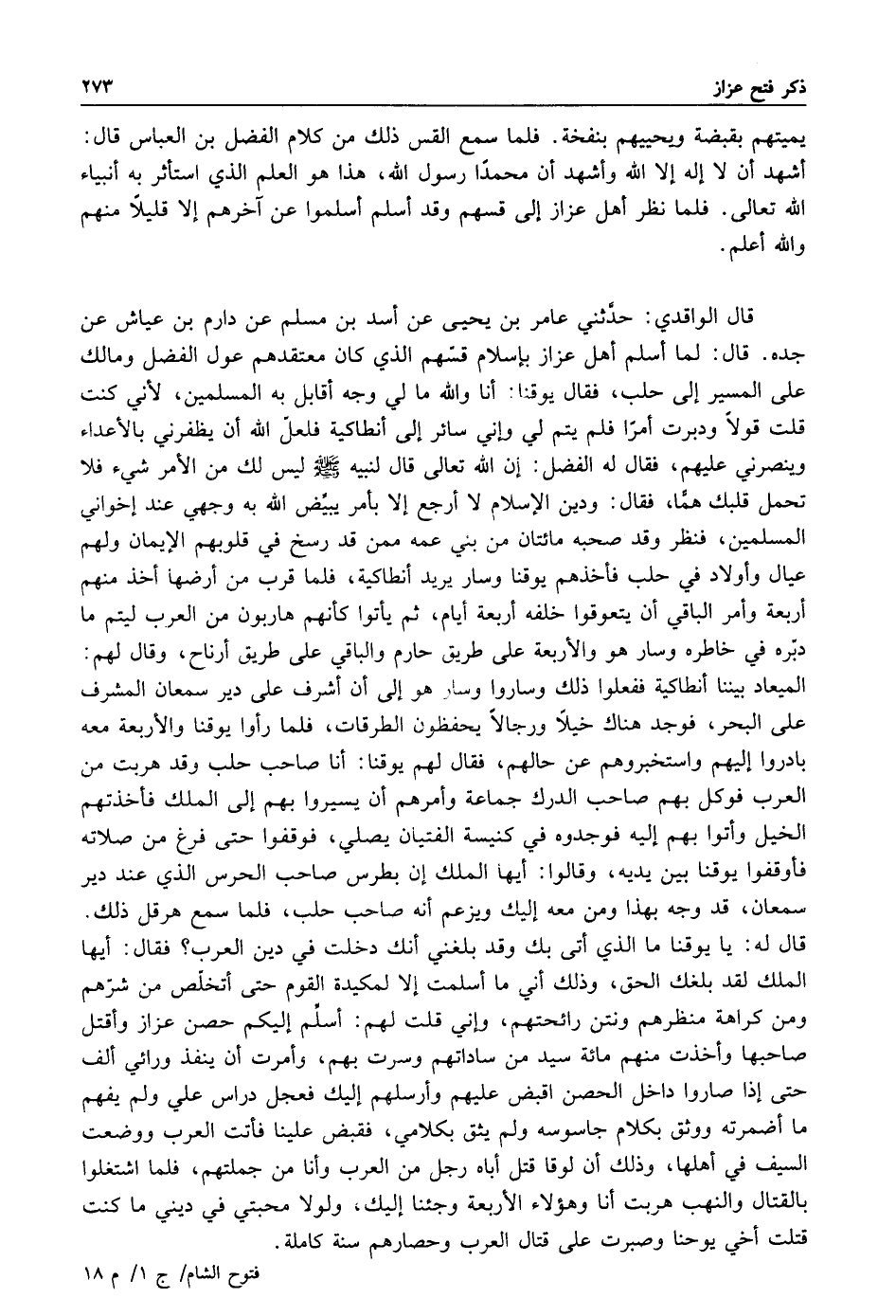 يميتهم بقبضة ويحييهم بنفخة فلما سمع القس ذلك من كلام الفضل ابن العباس قال: أشهد أن لا إله إلا الله وأشهد أن محمدا رسول الله هذا هو العلم الذي استأثر به انبياء الله تعالى فلما نظر أهل عزاز إلى قسهم وقد أسلم اسلموا عن آخرهم إلا قليلا منهم والله أعلم.