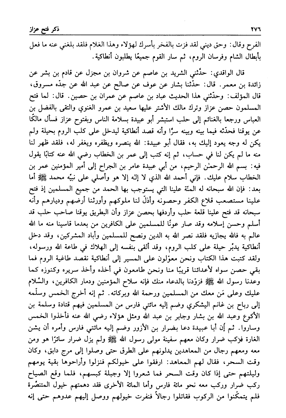 قال الواقدي: حدثني الشريد بن عاصم عن شروان بن مجزل عن قادم ابن بشر عن زائدة بن معمر قال حدثنا بشار عن عوف عن صالح عن عبد الله عن جده مسروق قال المؤلف وحدثني هذا الحديث عباد بن عاصم عن عمران بن حصين قال لما فتح المسلمون حصن عزاز وترك مالك الاشتر عليها سعيد بن عمرو الغنوي والتقى بالفضل بن العباس ورجعا بالغنائم إلى حلب استبشر أبو عبيدة بسلامة الناس وبفتوح عزاز فسأل مالكا عن يوقنا فحدثه فيما بينه وبينه سرا وأنه قصد أنطاكية ليدخل على كلب الروم بحيلة ولم يكن له وجه يعود إليك به فقال أبو عبيدة: الله ينصره ويظفره ويغفر له فلقد ظهر لنا منه ما لم يكن لنا في حساب ثم إنه كتب إلى عمر بن الخطاب رضي الله عنه كتابا يقول فيه: بسم الله الرحمن الرحيم من ابي عبيدة عامر بن الجراح إلى أمير المؤمنين عمر بن الخطاب سلام عليك فاني أحمد الله الذي لا إله إلا هو وأصلي على نبيه محمد صلى الله عليه وسلم أما بعد فإن الله سبحانه له المنة علينا التي يستوجب بها الحمد من جميع المسلمين إذ فتح علينا مستصعب قلاع الكفر وحصونه وأذل لنا ملوكهم وأورثنا ارضهم وديارهم وأن سبحانه قد فتح علينا قلعة حلب وأردفها بحصن عزاز وأن البطريق يوقنا صاحب حلب قد أسلم وحسن اسلامه وقد صار عونا للمسلمين على الكافرين من بعد ما قاسينا منه ما الله عالم به فالله يجازيه فلقد نصر الله به الدين ونصح للمسلمين وأباد المشركين وقد دخل انطاكية يدبر حيلة على كلب الروم وقد ألقى بنفسه إلى الهلاك في طاعة الله ورسوله ولقد كتبت هذا الكتاب ونحن معولون على المسير إلى أنطاكية نقصد طاغية الروم فما بقي حصن سواه لأعدائنا قريبا منا ونحن طامعون في أخذه وأخذ سريره وكنوزه كما وعدنا رسول الله صلى الله عليه وسلم فزودنا بالدعاء منك فإنه سلاح المؤمنين ودمار الكافرين والسلام عليك وعلى من معك من المسلمين ورحمة الله وبركاته ثم إنه أخرج الخمس وسلمه إلى رباح بن غانم اليشكري وضم إليه مائتي فارس من المسلمين فيهم قتادة وسلمة بن الأكوع وعبد الله بن بشار وجابر بن عبد الله ومثل هؤلاء رضي الله عنهم فأخذوا الخمس وساروا ثم أن أبا عبيدة دعا بضرار بن الأزور وضم إليه مائتي فارس وأمره أن يشن الغارة فركب ضرار وكان معهم سفينة مولى رسول الله صلى الله عليه وسلم ولم يزل ضرار سائرا هو ومن معه ومعهم رجال من المعاهدين يدلونهم على الطرق حتى وصلوا إلى مرج دابق وكان وقت السحر فقال لهم المعاهد: ارفقوا على خيولكم فنزلوا وأراحوها بقية يومهم وليلتهم حتى إذا كان وقت السحر فما شعروا إلا وجبلة كبسهم فلما وقع الصياح ركب ضرار وركب معه نحو مائة فارس وأما المائة الأخرى فقد دهمتهم خيول المتنصرة فلم يتمكنوا من الركوب فقاتلوا رجالا فنفرت خيولهم ووصل إليهم عدوهم حتى إنه