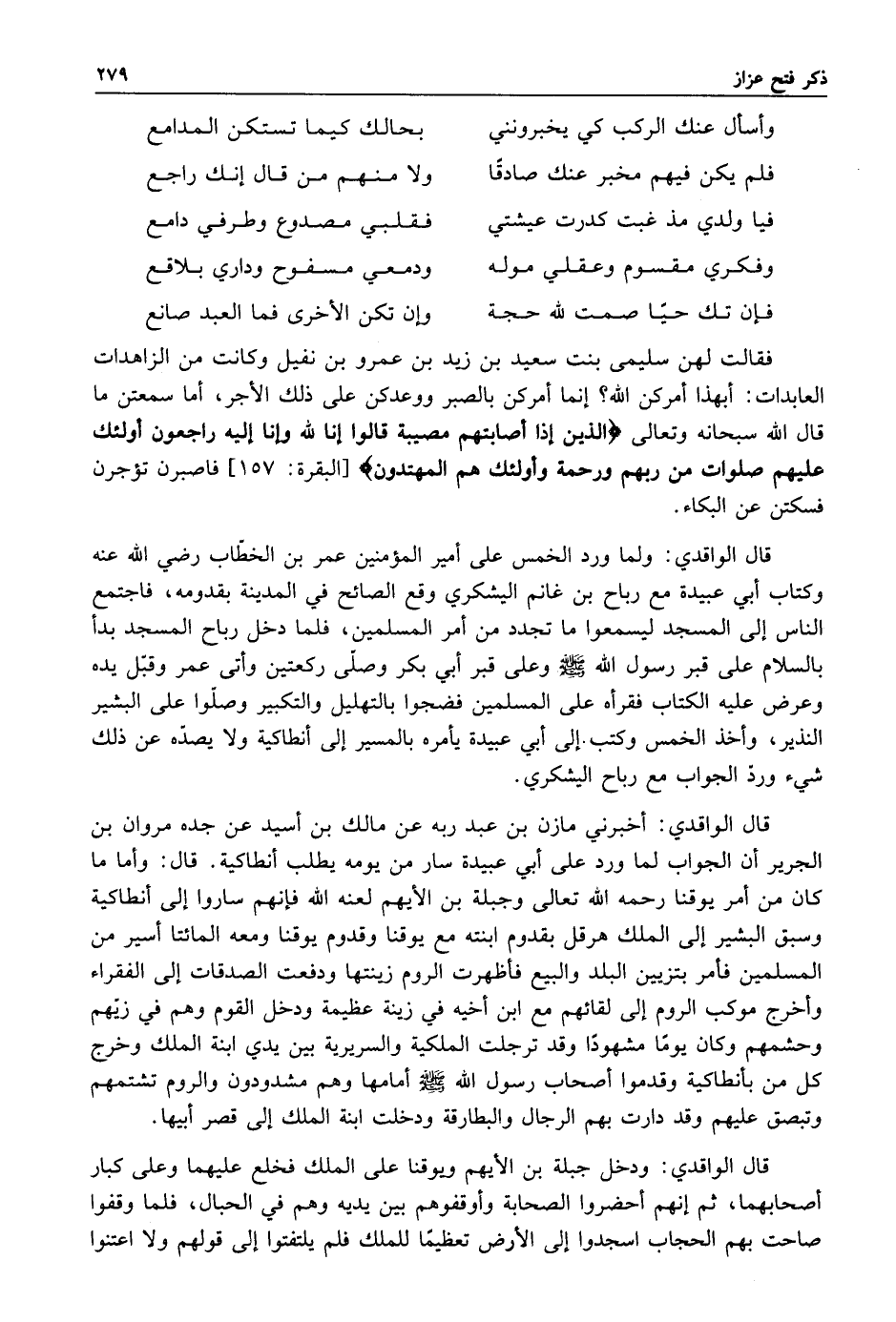فقالت لهم سليمى بنت سعيد بن زيد بن عمرو بن نفيل وكانت من الزاهدات العابدات أبهذا أمركن الله انما امركن بالصبر ووعدكن على ذلك الأجر أما سمعتن ما قال الله سبحانه وتعالى: {الَّذِينَ إِذَا أَصَابَتْهُمْ مُصِيبَةٌ قَالُوا إِنَّا لِلَّهِ وَإِنَّا إِلَيْهِ رَاجِعُونَ*أُولَئِكَ عَلَيْهِمْ صَلَوَاتٌ مِنْ رَبِّهِمْ وَرَحْمَةٌ وَأُولَئِكَ هُمُ الْمُهْتَدُونَ} [البقرة:157] فاصبرن تؤجرن فسكتن عن البكاء قال الواقدي: ولما ورد الخمس على أمير المؤمنين عمر بن الخطاب رضي الله عنه وكتاب أبي عبيدة مع رباح بن غانم اليشكري وقع الصائح في المدينة بقدومه فاجتمع الناس إلى المسجد ليسمعوا ما تجدد من أمر المسلمين فلما دخل رباح المسجد بدأ بالسلام على قبر رسول الله صلى الله عليه وسلم وعلى قبر أبي بكر وصلى ركعتين وأتى عمر وقبل يده وعرض عليه الكتاب فقرأه على المسلمين فضجوا بالتهليل والتكبير وصلوا على البشير النذير واخذ الخمس وكتب إلى ابي عبيدة يأمره بالمسير إلى انطاكية ولا يصده عن ذلك شيء ورد الجواب مع رباح اليشكري.