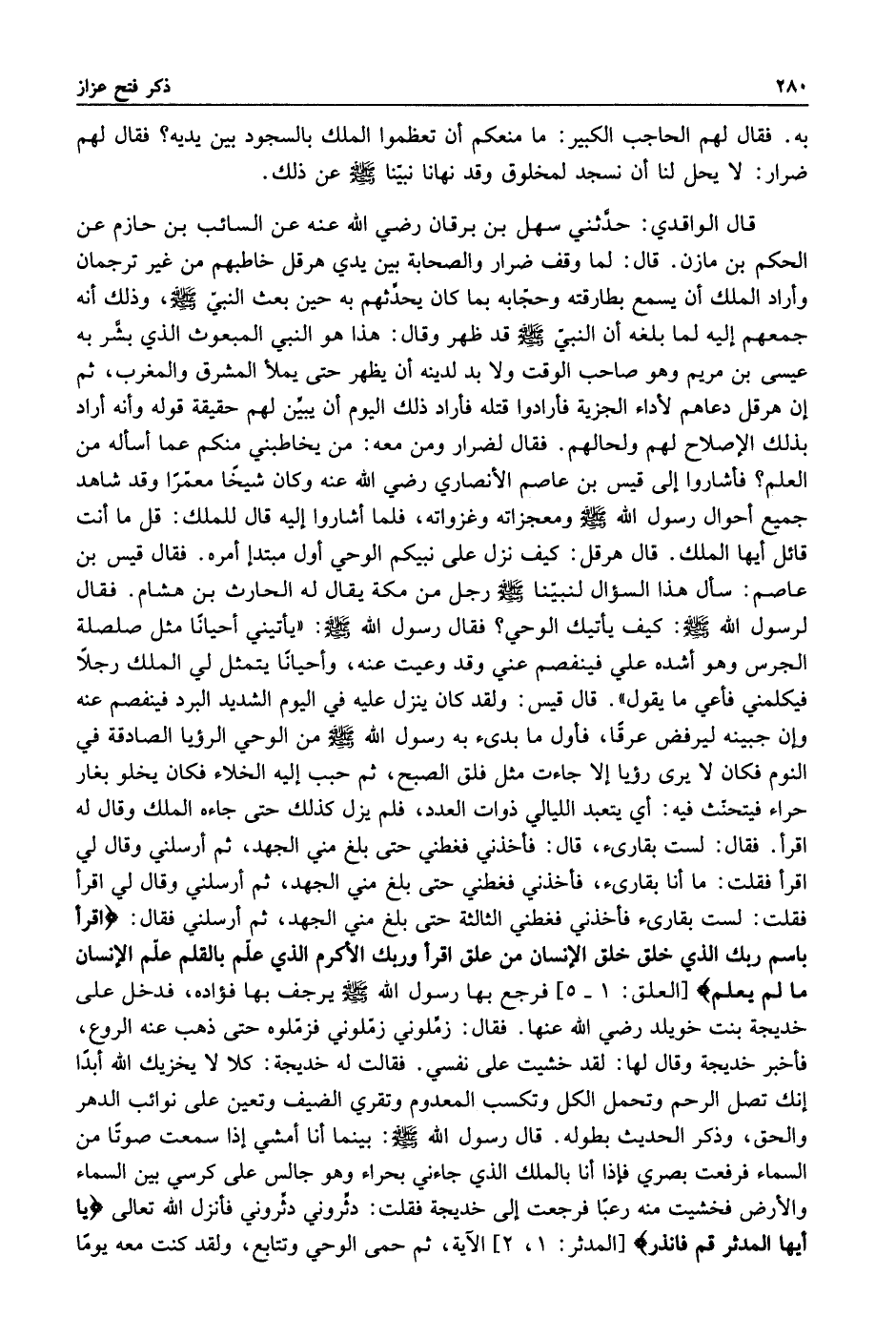 قال الواقدي: حدثني سهل بن برقان رضي الله عنه عن السائب بن جازم عن الحكم بن مازن قال لما وقف ضرار والصحابة بين يدي هرقل خاطبهم من غير ترجمان وأراد الملك أن يسمع بطارقته وحجابه بما كان يحدثهم به حين بعث النبي صلى الله عليه وسلم وذلك إنه جمعهم إليه لما بلغه أن النبي صلى الله عليه وسلم قد ظهر وقال هذا هو النبي المبعوث الذي بشر به عيسى بن مريم وهو صاحب الوقت ولا بد لدينه أن يظهر حتى يملأ المشرق والمغرب ثم أن هرقل دعاهم لأداء الجزية فأرادوا قتله فأراد ذلك اليوم أن يبين لهم حقيقة قوله وانه أراد بذلك الإصلاح لهم ولجالهم فقال لضرار ومن معه من يخاطبني منكم عما أسأله من العلم فأشاروا إلى قيس بن عاصم الأنصاري رضي الله عنه وكان شيخا معمرا وكان شاهد جميع أحوال رسول الله صلى الله عليه وسلم ومعجزاته وغزواته فلما أشاروا إليه قال للملك قل: ما أنت قائل أيها الملك قال هرقل: كيف نزل علي نبيكم الوحي أول مبتدأ أمره فقال قيس ابن عاصم سأل هذا السؤال لنبينا صلى الله عليه وسلم رجل من مكة يقال له الحرث بن هشام: فقال لرسول الله صلى الله عليه وسلم كيف يأتيك الوحي فقال رسول الله صلى الله عليه وسلم: "يأتيني أحيانا مثل صلصلة الجرس وهو أشده علي فينفصم عني وقد وعيت عنه وأحيانا يتمثل لي الملك رجلا فيكلمني فأعي ما يقول" قال قيس: ولقد كان ينزل عليه في اليوم الشديد البرد فينفصم عنه وأن جبينه ليرفض عرقا فأول ما بدىء به رسول الله صلى الله عليه وسلم من الوحي الرؤيا الصادقة في النوم فكان لا يرى رؤيا إلا جاءت مثل فلق الصبح ثم حبب إليه الخلاء فكان يخلو بغار حراء فيتحنث فيه أي يتعبد الليالي ذوات العدد فلم يزل كذلك حتى جاءه الملك وقال له: اقرأ فقال لست بقارىء قال فأخذني فغطني حتى بلغ مني الجهد ثم ارسلني وقال لي أرسلي اقرأ فقلت: ما أنا بقاريء فأخذني فغطني حتى بلغ مني الجهد ثم أرسلني فقال: {اقْرَأْ بِاسْمِ رَبِّكَ الَّذِي خَلَقَ , خَلَقَ الْأِنْسَانَ مِنْ عَلَقٍ , اقْرَأْ وَرَبُّكَ الْأَكْرَمُ , الَّذِي عَلَّمَ بِالْقَلَمِ , عَلَّمَ الْأِنْسَانَ مَا لَمْ يَعْلَمْ} فرجع بها رسول الله صلى الله عليه وسلم يرجف بهافؤاده فدخل على خديجة بنت خويلد رضي الله عنها فقال زملوني زملوني فزملوه حتى ذهب عنه الروع فأخبر خديجة وقال لها: لقد خشيت على نفسي فقالت له خديجة: كالا لا يخزيك الله أبدا إنك تصل الرحم وتحمل الكل وتكسب المعدوم وتقوي الضعيف الضعيف وتعين على نوائب الدهر والحق وذكر الحديث بطوله قال رسول الله صلى الله عليه وسلم بينما أنا أمشي إذ سمعت صوتا من السماء فرفعت بصري فإذا أنا بالملك الذي جاءني بحراء وهو جالس على كرسي بين السماء والأرض فخشيت منه رعبا فرجعت إلى خديجة فقلت: دثروني دثروني فأنزل الله تعالى: {يَا أَيُّهَا الْمُدَّثِّرُ*قُمْ فَأَنْذِرْ} [المدثر: 1, 2] الاية ثم حمى الوحي وتتابع ولقد كنت معه يوما