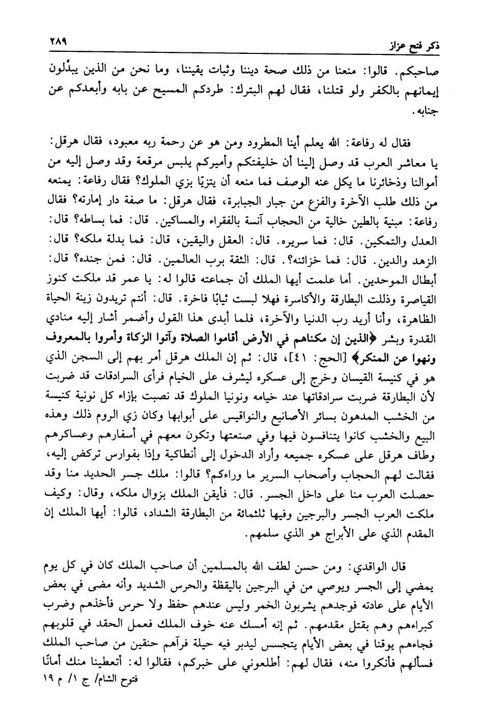 فقال له رفاعة: الله يعلم أينا المطرود ومن هو عن رحمة ربه مبعود فقال هرقل: يا معاشر العرب قد وصل إلينا أن خليفتكم وأميركم يلبس مرقعة وقد وصل إليه من أموالنا وذخائرنا ما يكل عنه الوصف فما منعه أن يتزيا بزي الملوك فقال رفاعة يمنعه من ذلك طلب الآخرة والفزع من جبار الجبابرة فقال هرقل: ما صفة دار أمارته فقال رفاعة مبنية بالطين خالية من الحجاب آنسة بالفقراء والمساكين قال فما بساطه قال العدل والتمكين قال فما سريره قال العقل واليقين قال فما بدلة ملكه قال الزهد والدين قال فما خزائنه قال الثقة برب العالمين قال فمن جنده قال أبطال الموحدين أما علمت أيها الملك أن جماعته قالوا له: يا عمر قد ملكت كنوز القياصرة وذللت البطارقة والأكاسرة فهلا لبست ثيابا فاخرة قال أنتم تريدون زينة الحياة الظاهرة وأنا أريد رب الدنيا والآخرة فلما ابدى هذا القول وأضمر أشار إليه منادي القدرة وبشر: {الَّذِينَ إِنْ مَكَّنَّاهُمْ فِي الْأَرْضِ أَقَامُوا الصَّلاةَ وَآتَوُا الزَّكَاةَ وَأَمَرُوا بِالْمَعْرُوفِ وَنَهَوْا عَنِ الْمُنْكَرِ} [الحج: 41] قال ثم أن الملك هرقل أمر بهم إلى السجن الذي هو في كنيسة القيسان وخرج إلى عسكره ليشرف على الخيام فرأى السرادقات قد ضربت لأن البطارقة ضربت سرادقاتها عند خيامه ونونيا الملوك قد نصبت بازاء كل نونية كنيسة من الخشب المدهون بسائر الأصانيع والنواقيس على ابوابها وكان زي الروم ذلك وهذه البيع والخشب كانوا يتنافسون فيها وفي صنعتها وتكون معهم في أسفارهم وعساكرهم وطاف هرقل على عسكره جميعه وأراد الدخول إلى انطاكية وإذا بفوارس تركض إليه فقالت لهم: الحجاب وأصحاب السرير ما وراءكم قالوا: ملك جسر الحديد منا وقد حصلت العرب منا على داخل الجسر قال فأيقن الملك بزوال ملكه وقال: وكيف ملكت العرب الجسر والبرجين وفيها ثلثمائة من البطارقة الشداد قالوا: أيها الملك أن المقدم الذي على الأبراج هو الذي سلمهم.