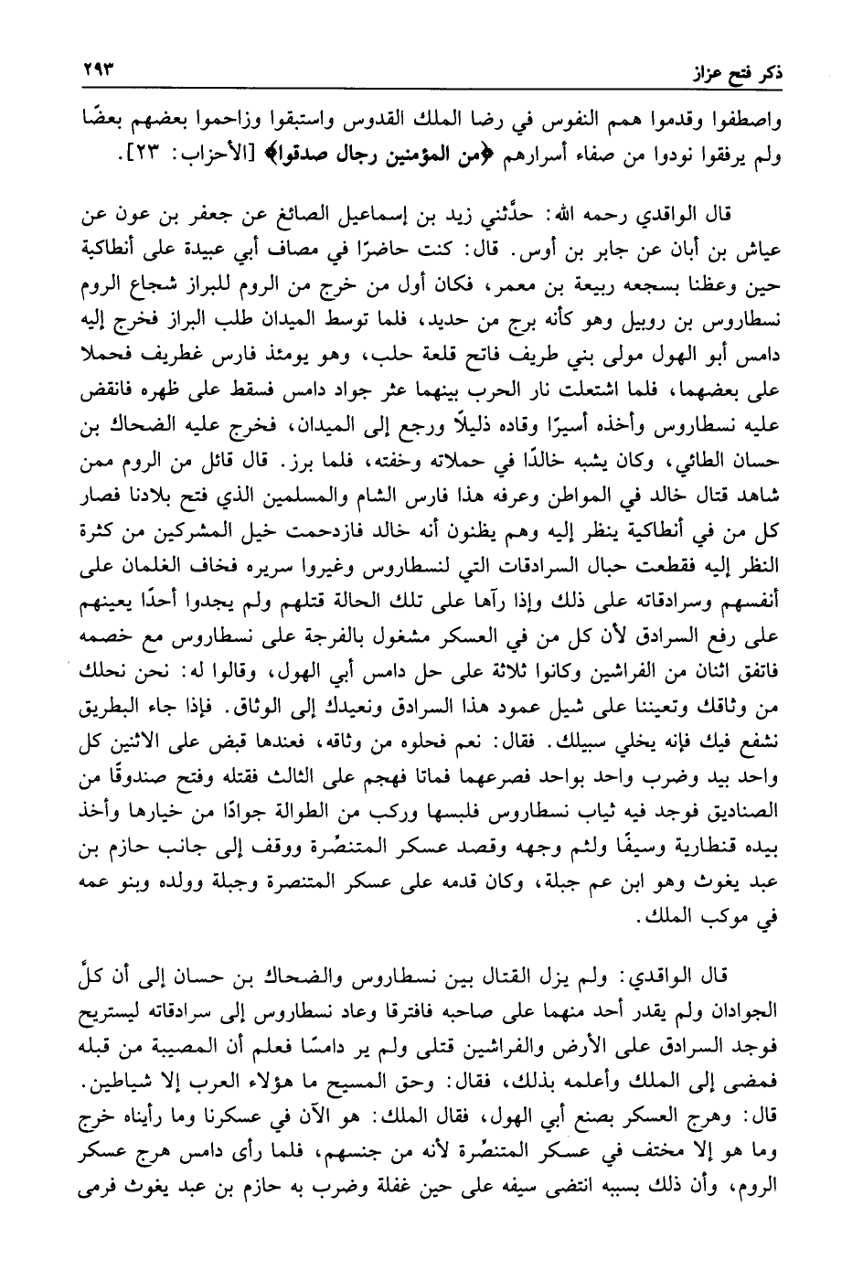 قال الواقدي: رحمه الله حدثني زيد بن اسماعيل الصائغ عن جعفر بن عون عن عياش ابن ابان عن جابر بن أوس قال كنت حاضرا في مصاف أبي عبيدة على انطاكية حين وعظنا بسجعه ربيعة بن معمر فكان أول من خرج من الروم للبراز شجاع الروم نسطاروس بن روبيل وهو كأنه برج من حديد فلما توسط الميدان طلب البراز فخرج إليه دامس أبو الهول مولى بني طريف فاتح قلعة حلب وهو يومئذ فارس غطريف فحملا على بعضهما فلما اشتعلت نار الحرب بينهما عثر جواد دامس فسقط على ظهره فانقض عليه نسطاروس وأخذه أسيرا وقاده ذليلا ورجع إلى الميدان فخرج عليه الضحاك بن حسان الطائي وكان يشبه خالدا في حملاته وخفته فلما برز قال قائل من الروم ممن شاهد قتال خالد في المواطن وعرفه هذا فارس الشام والمسلمين الذي فتح بلادنا فصار كل من في انطاكية ينظر إليه وهم يظنون إنه خالد فازدحمت خيل المشركين من كثرة النظر إليه فقطعت حبال السرادقات التي لنسطاروس وغيروا سريره فخاف الغلمان على أنفسهم وسرادقاته على ذلك وإذا رآها على تلك الحالة قتلهم ولم يجدوا أحدا يعينهم على رفع السرادق لأن كل من في العسكر مشغول بالفرجة على نسطاروس مع خصمه فاتفق اثنان من الفراشين وكانوا ثلاثة على حل دامس أبي الهول وقالوا له: نحن نحلك من وثاقك وتعيننا على شيل عمود هذا السرادق ونعيدك إلى الوثاق فإذا جاء البطريق نشفع فيك فإنه يخلي سبيلك فقال: نعم فحلوه من وثاقه فعندها قبض على الاثنين كل واحد بيد وضرب واحد بواحد فصرعهما فماتا فهجم على الثالث فقتله وفتح صندوقا من الصناديق فوجد فيه ثياب نسطاروس فلبسها وركب من الطوالة جوادا من خيارها وأخذ بيده قنطارية وسيفا ولثم وجهه وقصد عسكر المتنصرة ووقف إلى جانب حازم بن عبد يغوث وهو ابن عم جبلة وكان قدمه على عسكر المنتصرة وجبلة وولده وبنو عمه في موكب الملك.