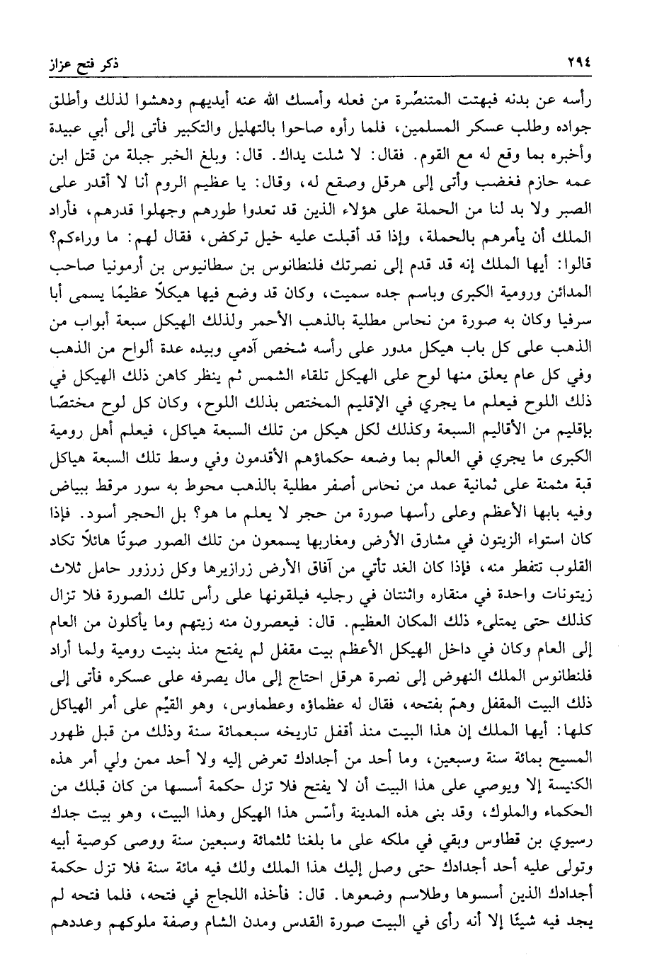 رأسه عن بدنه فبهتت المتنصرة من فعله وأمسك الله عنه ايديهم ودهشوا لذلك وأطلق جواده وطلب عسكر المسلمين فلما راوه صاحوا بالتهليل والتكبير فأتى إلى ابي عبيدة وأخبره بما وقع له مع القوم فقال: لا شلت يداك قال: وبلغ الخبر جبلة من قتل ابن عمه حازم فغضب وأتى إلى هرقل وصقع له وقال: يا عظيم الروم أنا لا أقدر على الصبر ولا بد لنا من الحملة على هؤلاء الذين قد تعدوا طورهم وجهلوا قدرهم فاراد الملك أن يأمرهم بالحملة وإذا قد اقبلت عليه خيل تركض فقال لهم: ما وراءكم قالوا: أيها الملك إنه قد قدم إلى نصرتك فلنطانوس بن سطانيوس بن أرمونيا صاحب المدائن ورومية الكبرى وباسم جده سميت وكان قدج وضع فيها هيكلا عظيما يسمى أبا سرفيا وكان به صورة من نحاس مطلية بالذهب الأحمد ولذلك الهيكل سبعة أبواب من الذهب على كل باب هيكل مدور على رأسه شخص آدمي وبيده عدة الواح من الذهب وفي كل عام يعلق منها لوح على الهيكل تلقاء الشمس ثم ينظر كاهن ذلك الهيكل في ذلك اللوح فيعلم ما يجري في الإقليم المختص بذلك اللوح وكان كل لوح مختصا بأقليم من الأقاليم السبعة وكذلك لكل هيكل من تلك السبعة هياكل فيعلم أهل رومية الكبرى ما يجري في العالم بما وضعه حكماؤهم الأقدمون وفي وسط تلك السبعة هياكل قبة مثمنة على ثمانية عمد من نحاس اصفر مطلية بالذهب محوط به سور مرقط ببياض وفيه بابها الأعظم وعلى رأسها صورة من حجر لا يعلم ما هو بل الحجر أسود فإذا كان استواء الزيتون في مشارق الأرض ومغاربها يسمعون من تلك الصور صوتا هائلا تكاد القلوب تتفطر منه فإذا كان الغد تأتي من آفاق الأرض زارزيرها وكل زرزور حامل ثلاث زيتونات واحدة في منقاره واثنتان في رجليه فيلقونها على رأس تلك الصورة فلا تزال كذلك حتى يمتلىء ذلك المكان العظيم قال فيعصرون منه زيتهم وما يأكلون من العام إلى العام وكان في داخل الهيكل الأعظم بيت مقفل لم يفتح منذ بنيت رومية ولما أراد فلنطانوس الملك النهوض إلى نصرة هرقل احتاج إلى مال يصرفه على عسكره فأتى إلى ذلك البيت المقفل وهم بفتحه فقال له عظماؤه وعطماوس وهو القيم على أمر الهياكل كلها أيها الملك أن هذا البيت منذ أقفل تاريخه سبعمائة سنة وذلك من قبل ظهور المسيح بمائة سنة وسبعين وما أحد من أجدادك تعرض إليه ولا أحد ممن ولى أمر هذه الكنيسة إلا ويوصي على هذا البيت أن لا يفتح فلا تزل حكمة اسسها من كان قبلك من الحكماء والملوك وقد بنى هذه المدينة وأسس هذا الهيكل وهذا البيت وهو بيت جدك رسيوي بن قطاوس وبقي في ملكه على ما بلغنا ثلثمائة وسبعين سنة ووصي كوصية أبيه وتولى عليه أحد أجدادك حتى وصل إليك هذا الملك ولك فيه مائة سنة فلا تزل حكمة أجدادك اجدادك الذين اسسوها وطلاسم وضعوها قال فأخذه اللجاج في فتحه فلما فتحه لم يجد فيه شيئا إلا إنه رأى في البيت صورة القدس مدن الشام وصفة ملوكهم وعددهم