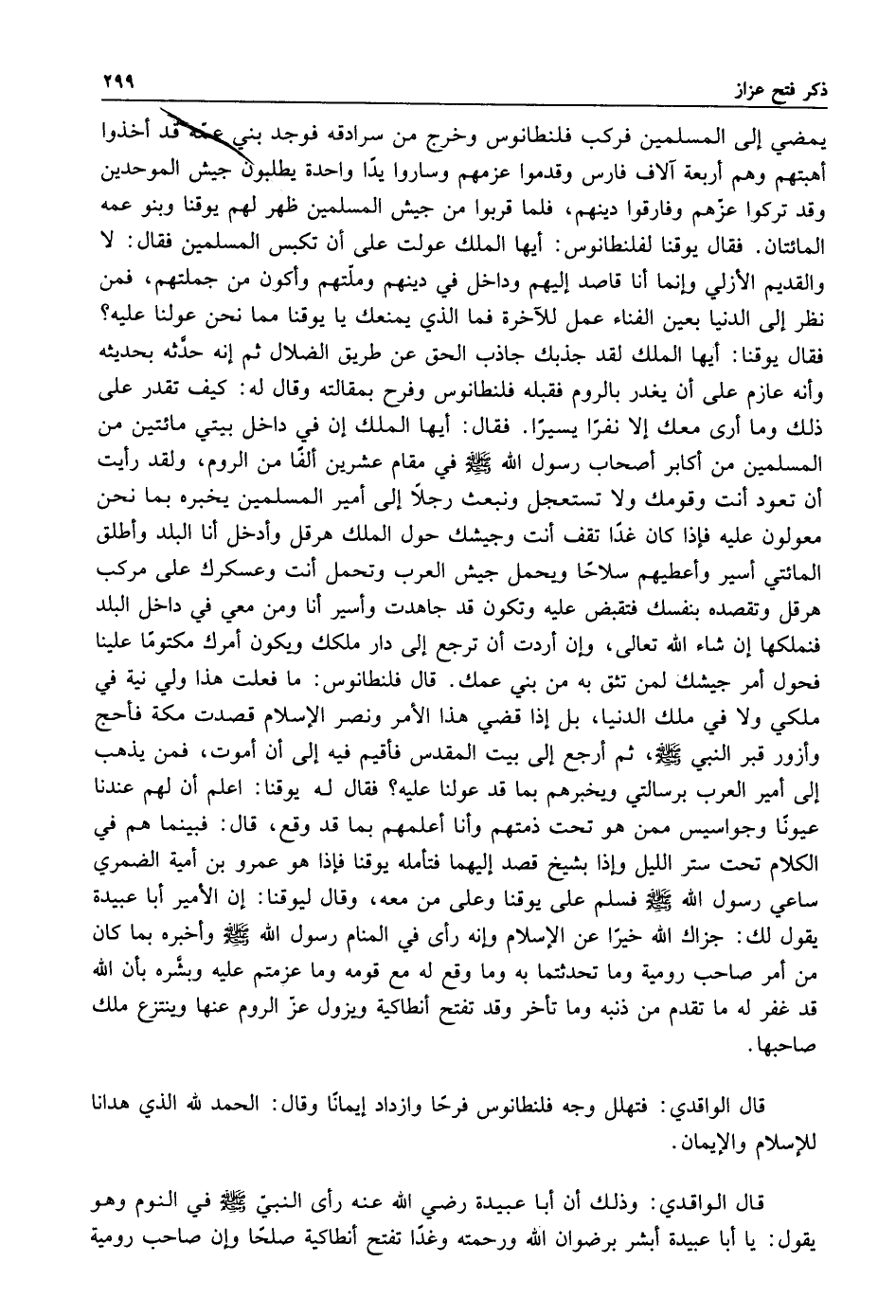 قال الواقدي: فتهلل وجه فلنطانوس فرحا وازداد ايمانا وقال الحمد لله الذي هدانا للاسلام والإيمان.