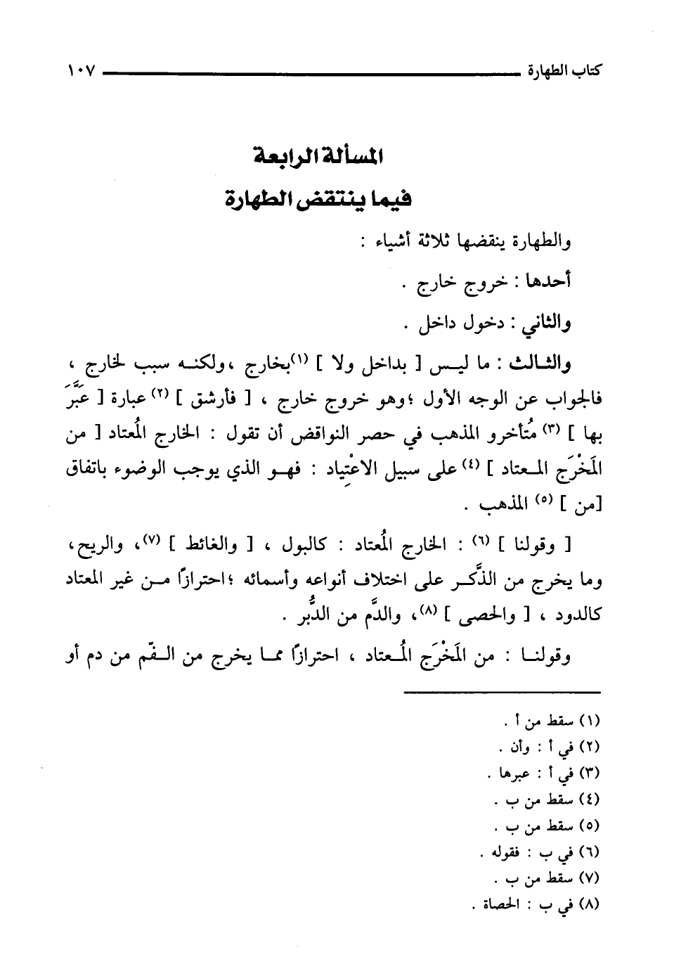 والثالث: ما ليس [بداخل ولا] (¬1) بخارج، ولكنه سبب لخارج، فالجواب عن الوجه الأول؛ وهو خروج خارج، [فأرشق] (¬2) عبارة [عَبَّرَ بها] (¬3) مُتأخرو المذهب في حصر النواقض أن تقول: الخارج المُعتاد [من المَخْرَج المعتاد] (¬4) على سبيل الاعْتِياد: فهو الذي يوجب الوضوء باتفاق [من] (¬5) المذهب.