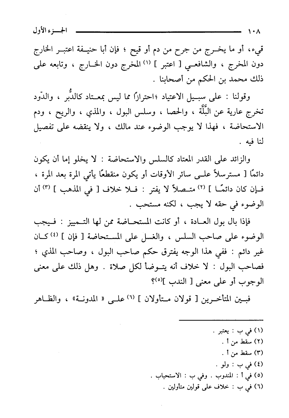 فإذا بال بول العادة، أو كانت المستحاضة ممن لها التمييز: فيجب الوضوء على صاحب السلس، والغسل على المستحاضة [فإن] (¬4) كان غير دائم: ففي هذا الوجه يفترق حكم صاحب البول، وصاحب المذي؛ فصاحب البول: لا خلاف أنه يتوضأ لكل صلاة. وهل ذلك على معنى الوجوب أو على معنى [الندب] (¬5)؟