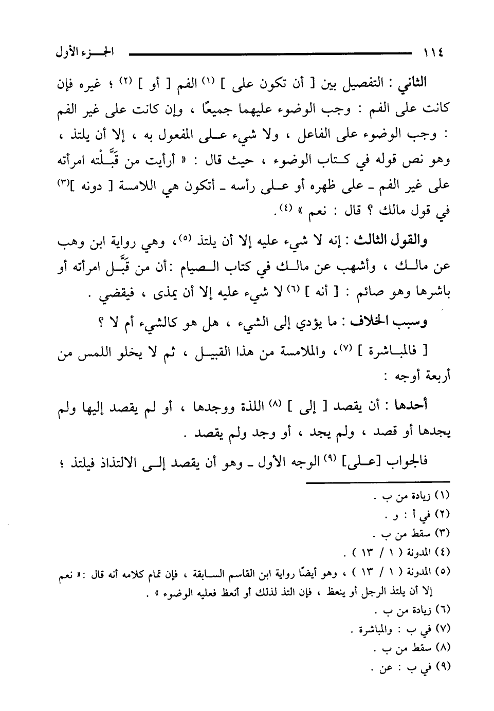 (¬5) المدونة (1/ 13)، وهو أيضًا رواية ابن القاسم السابقة، فإن تمام كلامه أنه قال: "نعم إلا أن يلتذ الرجل أو ينعظ، فإن التذ لذلك أو أنعظ فعليه الوضوء".