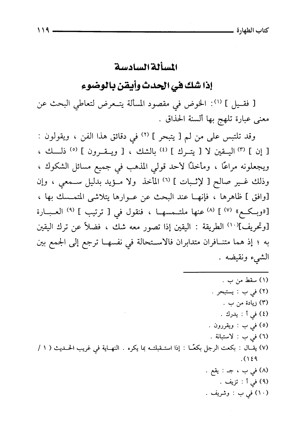 وقد تلتبس على من لم [يتبحر] (¬2) في دقائق هذا الفن، ويقولون: [إن] (¬3) اليقين لا [يترك] (¬4) بالشك، [ويقرون] (¬5) ذلك، ويجعلونه مراعًا، ومأخذًا لأحد قولي المذهب في جميع مسائل الشكوك، وذلك غير صالح [لإثبات] (¬6) المأخذ ولا مؤيد بدليل سمعي، وإن [وافق] ظاهرها، فإنها عند البحث عن عوارها يتلاشى المتمسك بها، ["وبكع" (¬7)] (¬8) عنها ملتمسها، فنقول في [ترتيب] (¬9) العبارة [وتحريف] (¬10) الطريقة: اليقين إذا تصور معه شك، فضلًا عن ترك اليقين به؛ إذ هما متنافران متدابران فالاستحالة في نفسها ترجع إلى الجمع بين الشيء ونقيضه.