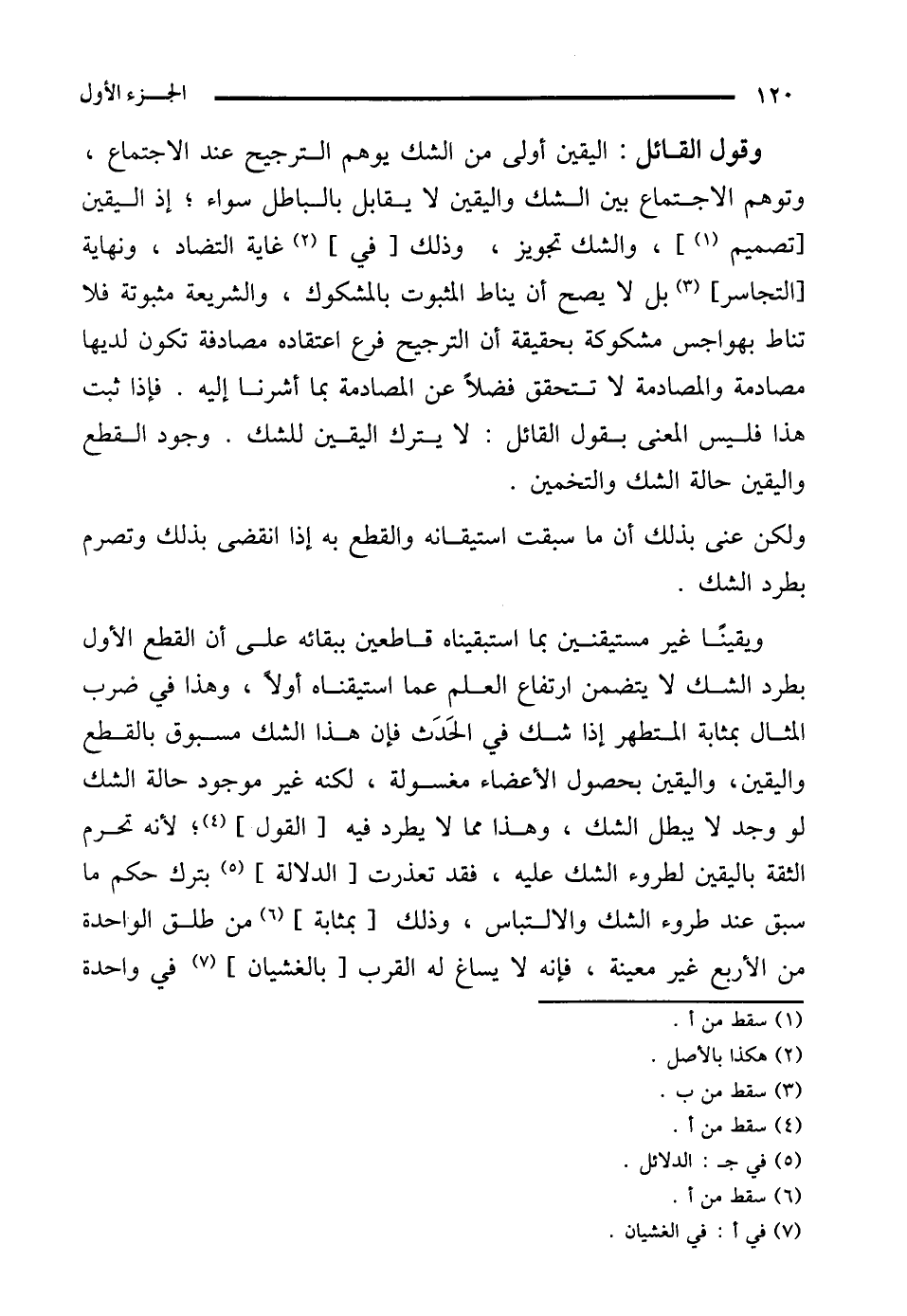 وقول القائل: اليقين أولى من الشك يوهم الترجيح عند الاجتماع، وتوهم الاجتماع بين الشك واليقين لا يقابل بالباطل سواء؛ إذ اليقين [تصميم (¬1)]، والشك تجويز، وذلك [في] (¬2) غاية التضاد، ونهاية [التجاسر] (¬3) بل لا يصح أن يناط المثبوت بالمشكوك، والشريعة مثبوتة فلا تناط بهواجس مشكوكة بحقيقة أن الترجيح فرع اعتقاده مصادفة تكون لديها مصادمة والمصادمة لا تتحقق فضلًا عن المصادمة بما أشرنا إليه. فإذا ثبت هذا فليس المعنى بقول القائل: لا يترك اليقين للشك. وجود القطع واليقن حالة الشك والتخمين.