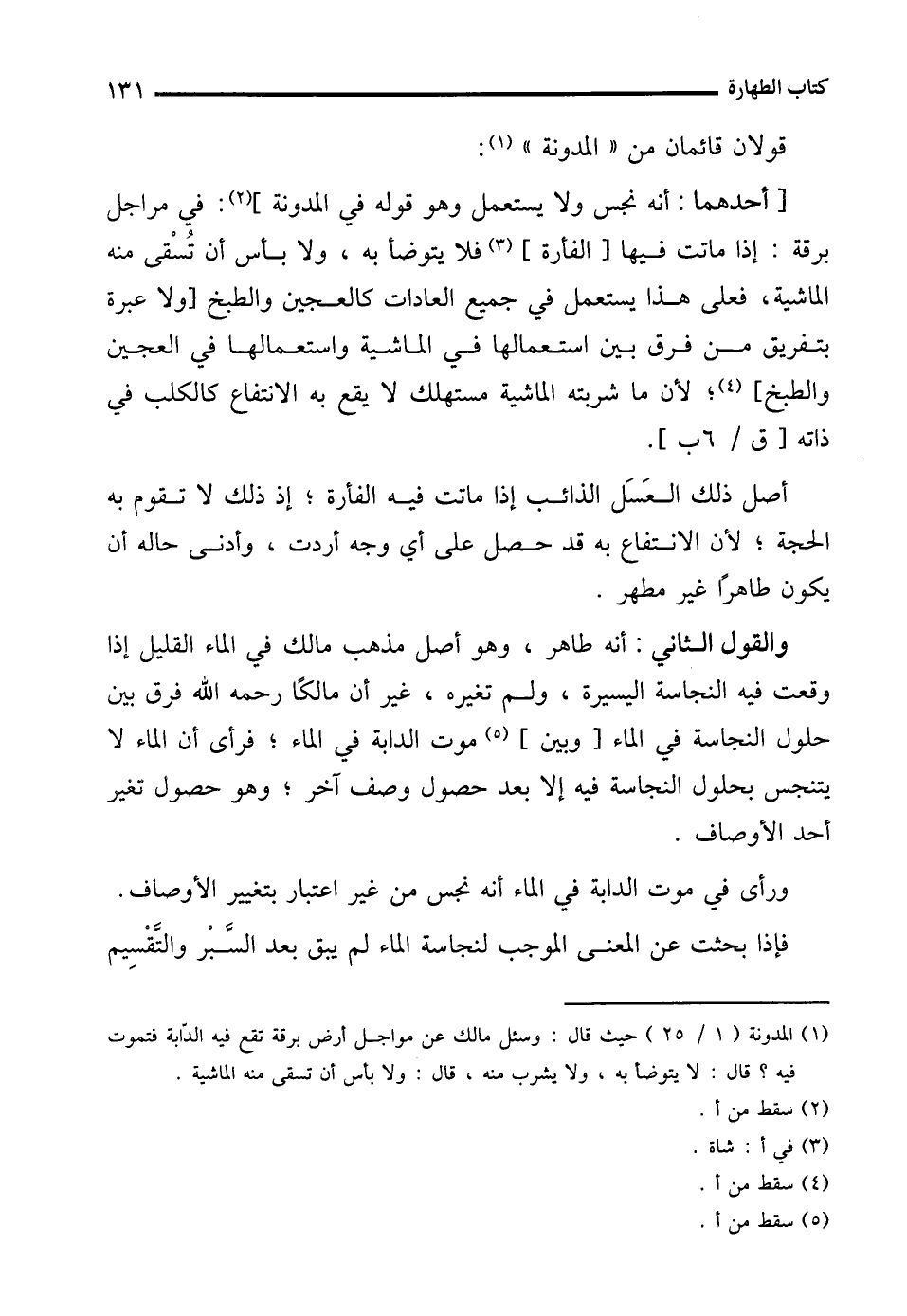 (¬1) المدونة (1/ 25) حيث قال: وسئل مالك عن مواجل أرض برقة تقع فيه الدّابة فتموت فيه؟ قال: لا يتوضأ به، ولا يشرب منه، قال: ولا بأس أن تسقى منه الماشية.