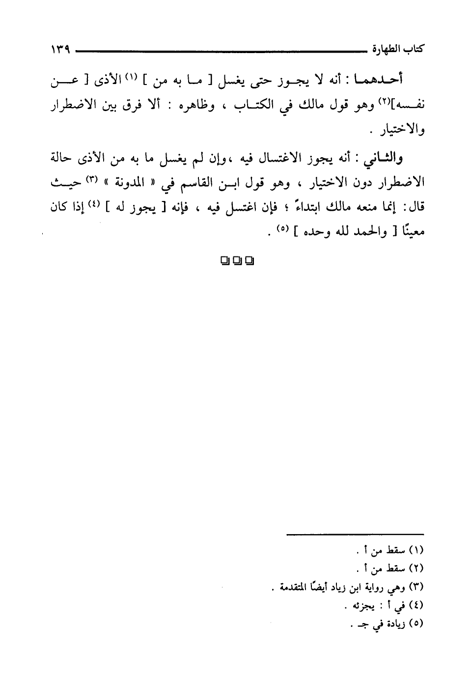 والثاني: أنه يجوز الاغتسال فيه، وإن لم يغسل ما به من الأذى حالة الاضطرار دون الاختيار، وهو قول ابن القاسم في "المدونة" (¬3) حيث قال: إنما منعه مالك ابتداءً؛ فإن اغتسل فيه، فإنه [يجوز له] (¬4) إذا كان معينًا [والحمد لله وحده] (¬5).