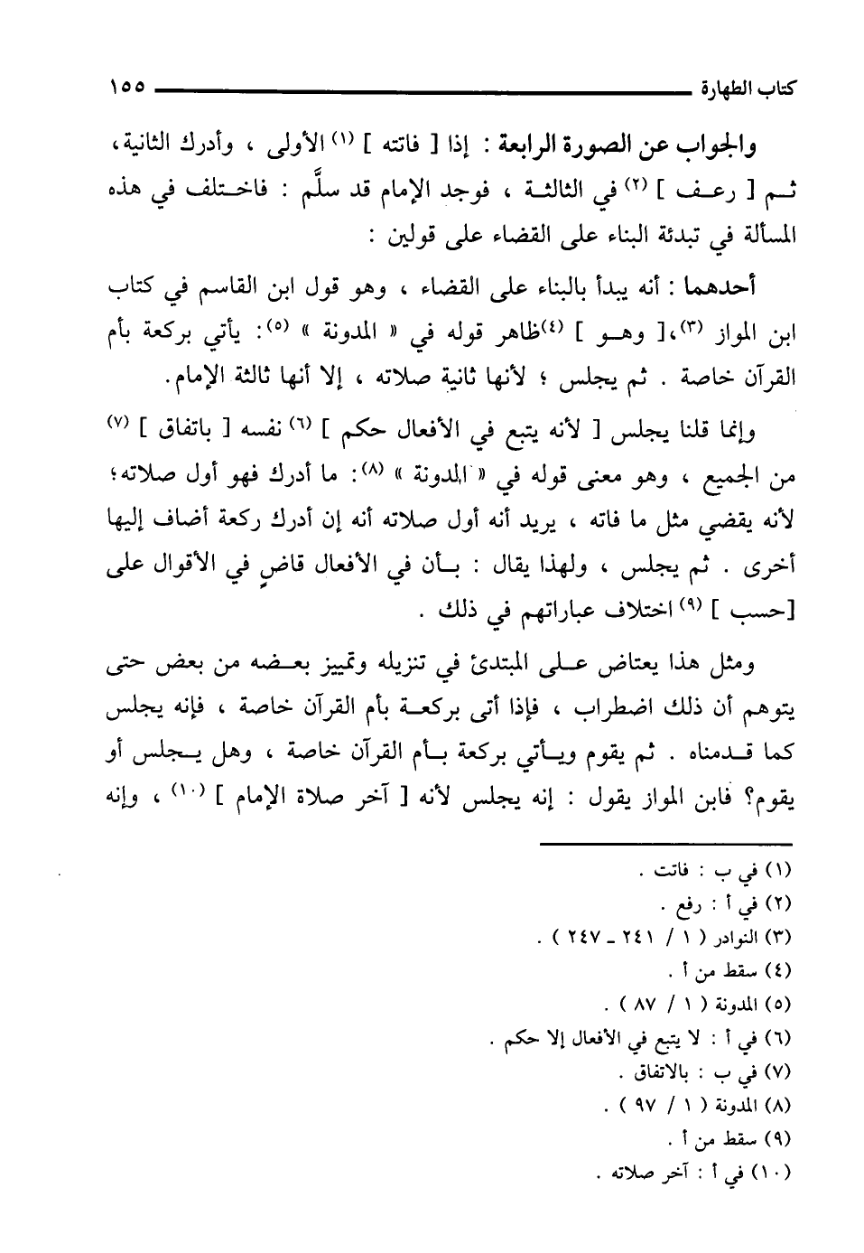 ومثل هذا يعتاض على المبتدئ في تنزيله وتمييز بعضه من بعض حتى يتوهم أن ذلك اضطراب، فإذا أتى بركعة بأم القرآن خاصة، فإنه يجلس كما قدمناه. ثم يقوم ويأتي بركعة بأم القرآن خاصة، وهل يجلس أو يقوم؟ فابن المواز يقول: إنه يجلس لأنه [آخر صلاة الإِمام] (¬10)، وإنه
