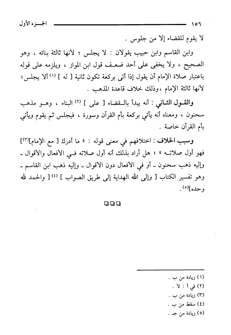 وسبب الخلاف: اختلافهم في معنى قوله: "ما أدرك [مع الإِمام] (¬3) فهو أول صلاته"؛ هل أراد بذلك أنه أول صلاته في الأفعال والأقوال -وإليه ذهب سحنون- أو في الأفعال دون الأقوال -وإليه ذهب ابن القاسم- وهو تفسير الكتاب [وإلى الله الهداية إلى طريق الصواب] (¬4) [والحمد لله وحده] (¬5).