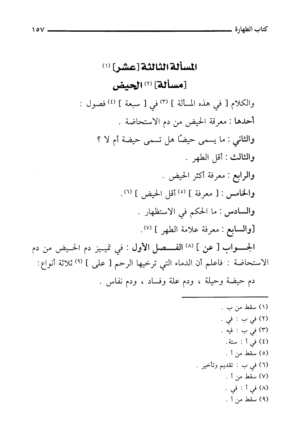الجواب [عن] (¬8) الفصل الأول: في تمييز دم المحيض من دم الاستحاضة: فاعلم أن الدماء التي ترخيها الرحم [على] (¬9) ثلاثة أنواع: دم حيضة وحيلة، ودم علة وفساد، ودم نفاس.