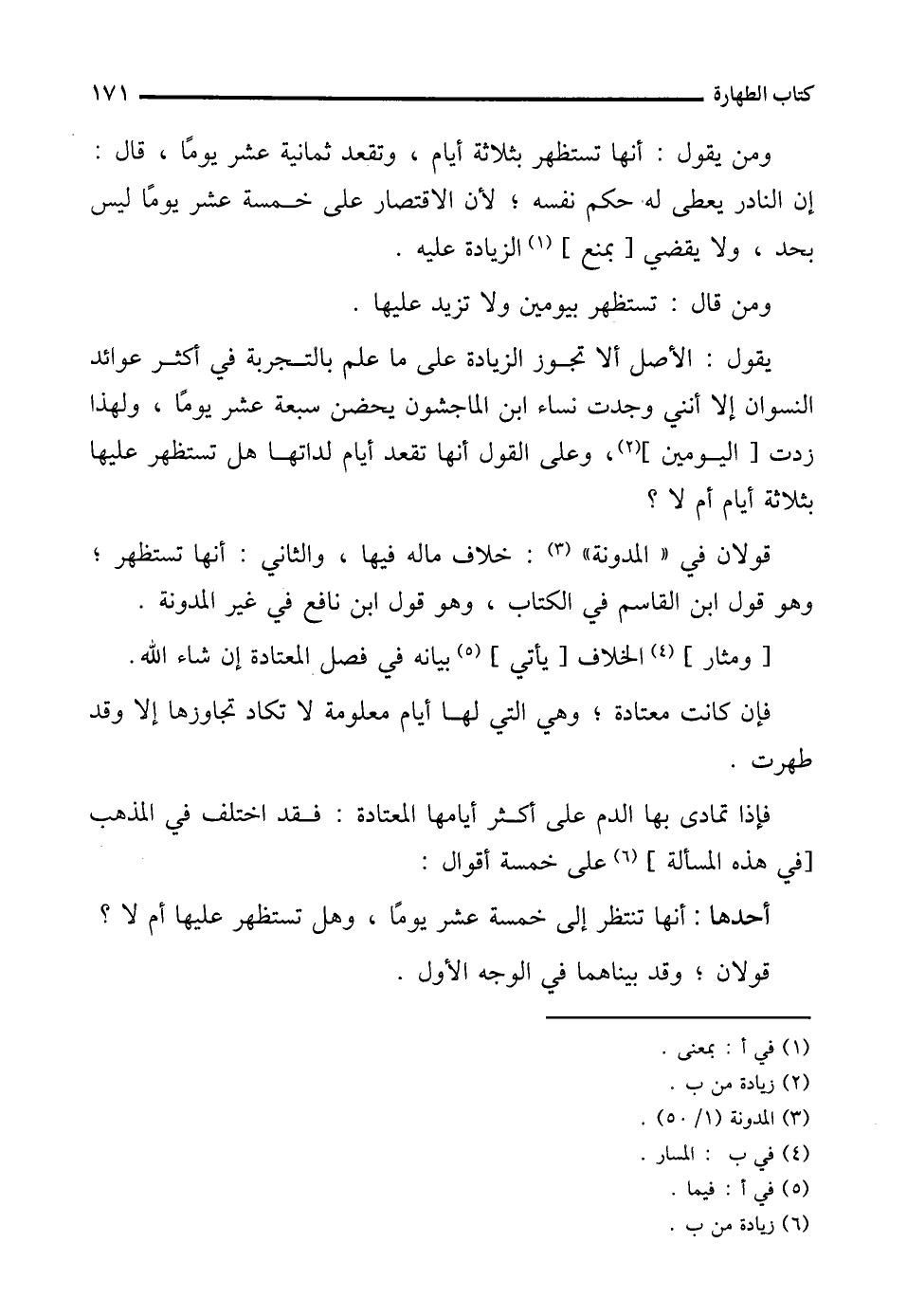 يقول: الأصل ألا تجوز الزيادة على ما علم بالتجربة في أكثر عوائد النسوان إلا أنني وجدت نساء ابن الماجشون يحضن سبعة عشر يومًا, ولهذا زدت [اليومين] (¬2)، وعلى القول أنها تقعد أيام لداتها هل تستظهر عليها بثلاثة أيام أم لا؟