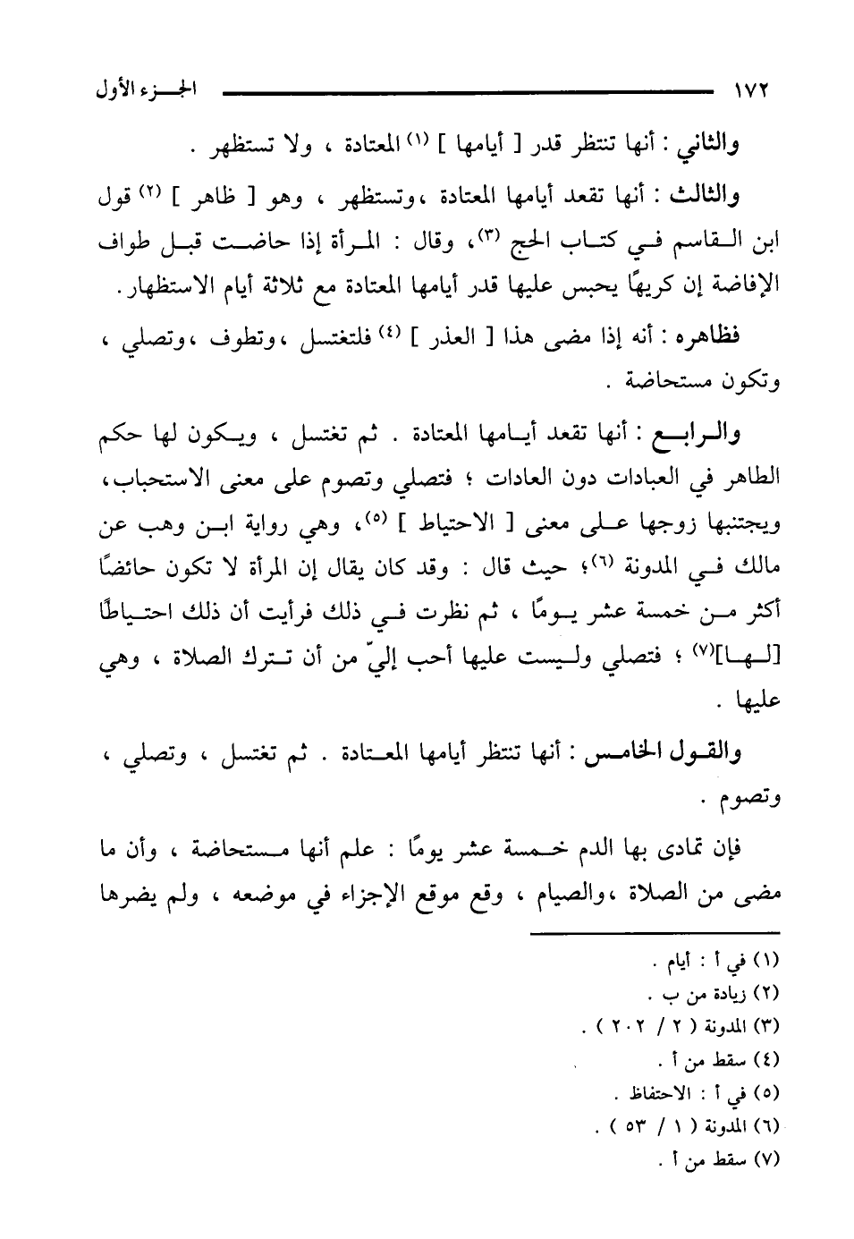 والرابع: أنها تقعد أيامها المعتادة. ثم تغتسل، ويكون لها حكم الطاهر في العبادات دون العادات؛ فتصلي وتصوم على معنى الاستحباب، ويجتنبها زوجها على معنى [الاحتياط] (¬5)، وهي رواية ابن وهب عن مالك في المدونة (¬6)؛ حيث قال: وقد كان يقال إن المرأة لا تكون حائضًا أكثر من خمسة عشر يومًا، ثم نظرت في ذلك فرأيت أن ذلك احتياطًا [لها] (¬7)؛ فتصلي وليست عليها أحب إليّ من أن تترك الصلاة، وهي عليها.