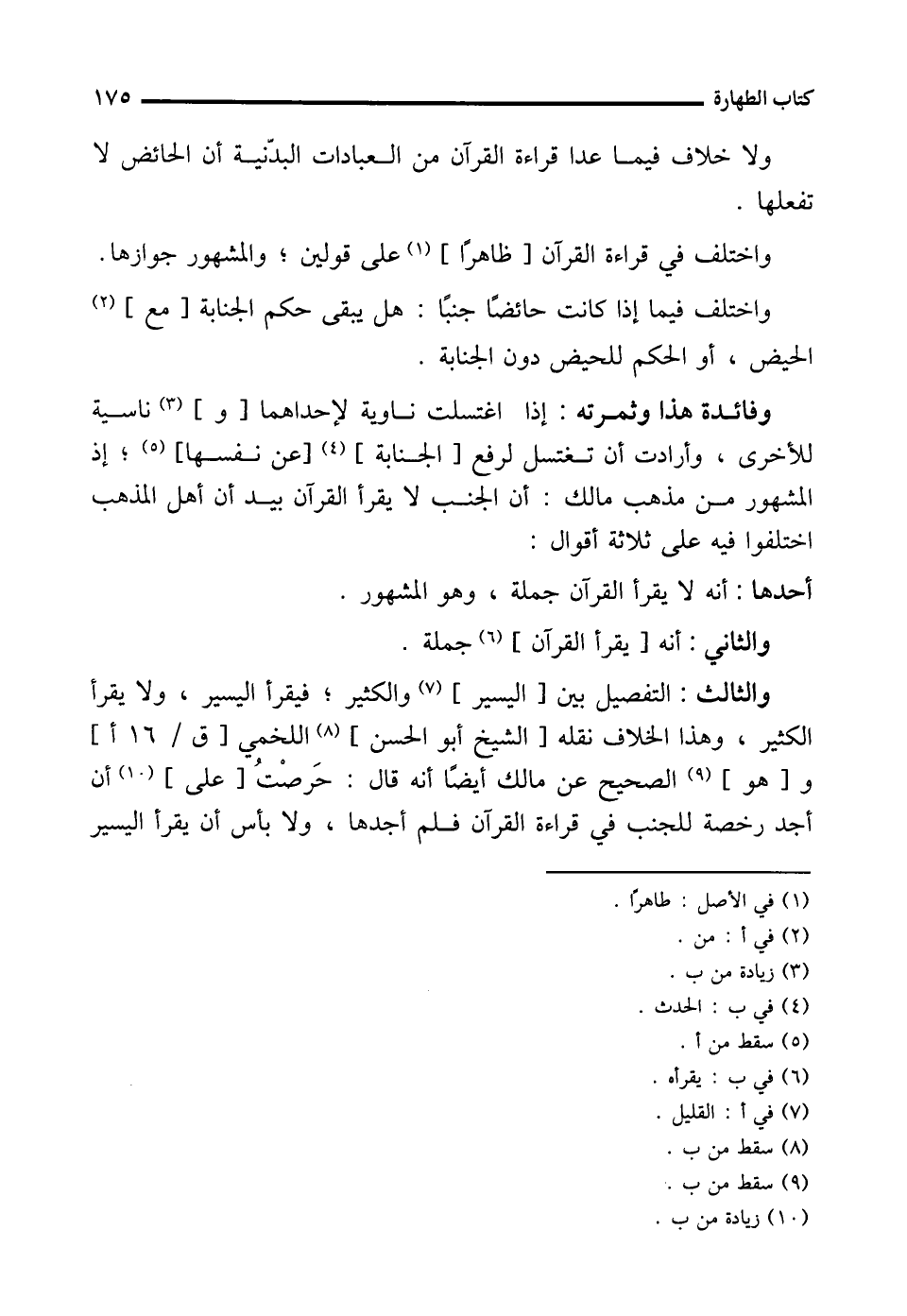وفائدة هذا وثمرته: إذا اغتسلت ناوية لإحداهما [و] (¬3) ناسية للأخرى، وأرادت أن تغتسل لرفع [الجنابة] (¬4) [عن نفسها] (¬5)، إذ المشهور من مذهب مالك: أن الجنب لا يقرأ القرآن بيد أن أهل المذهب اختلفوا فيه على ثلاثة أقوال: