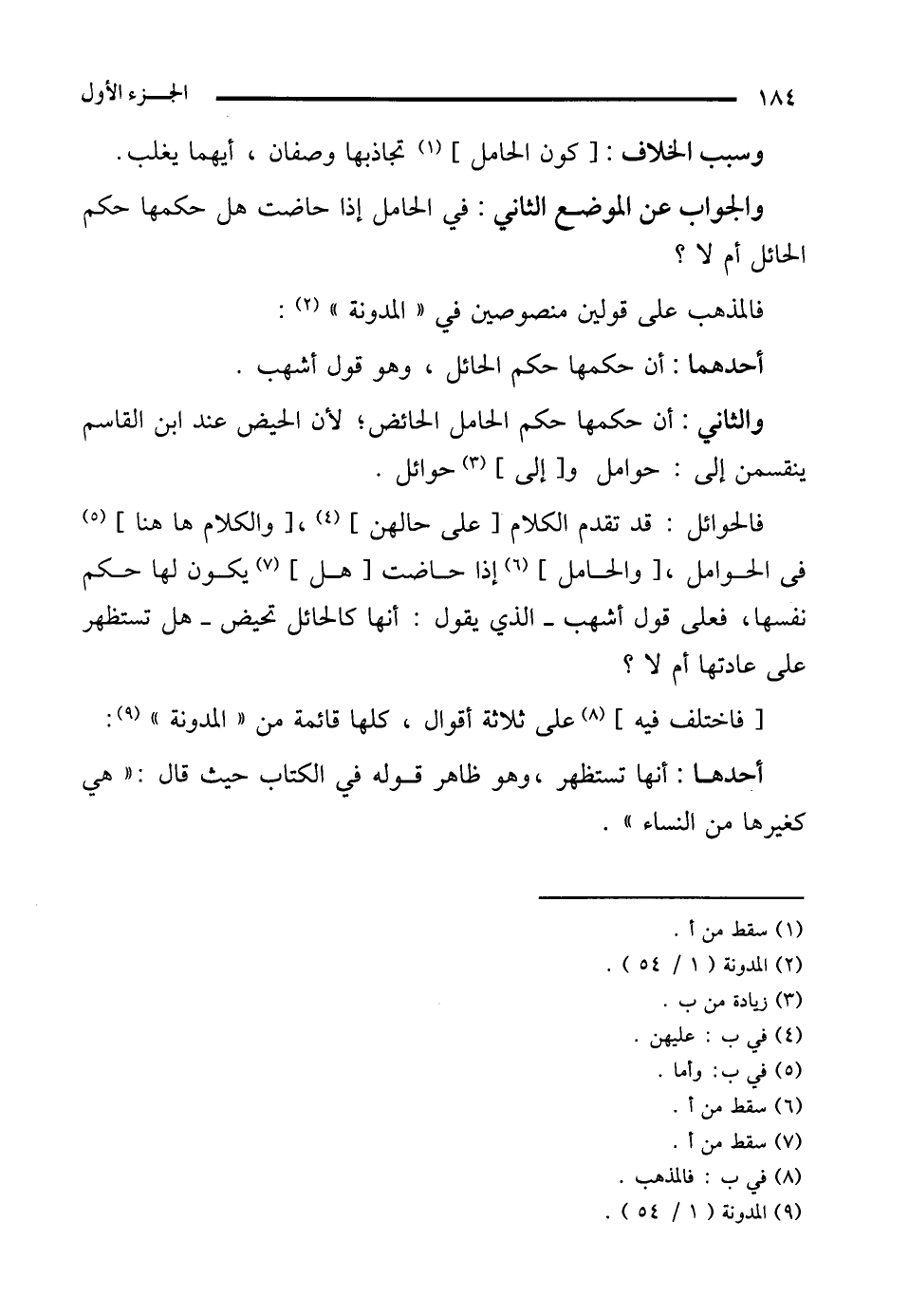 والثاني: أن حكمها حكم الحامل الحائض؛ لأن الحيض عند ابن القاسم ينقسمن إلى: حوامل و [إلى] (¬3) حوائل.