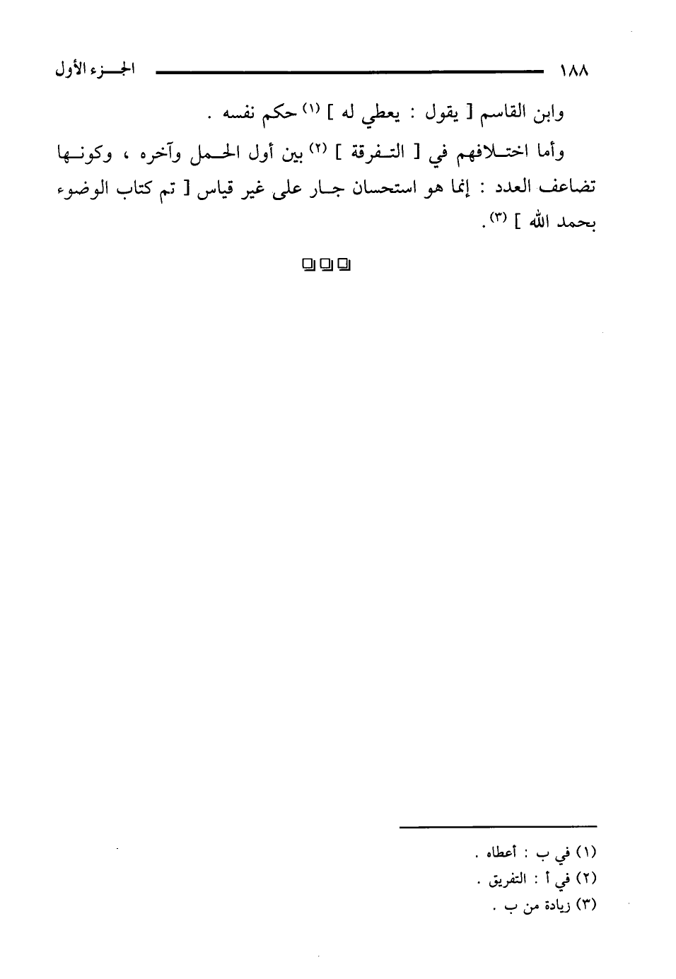 وأما اختلافهم في [التفرقة] (¬2) بين أول الحمل وآخره، وكونها تضاعف العدد: إنما هو استحسان جار على غير قياس [تم كتاب الوضوء بحمد الله] (¬3).