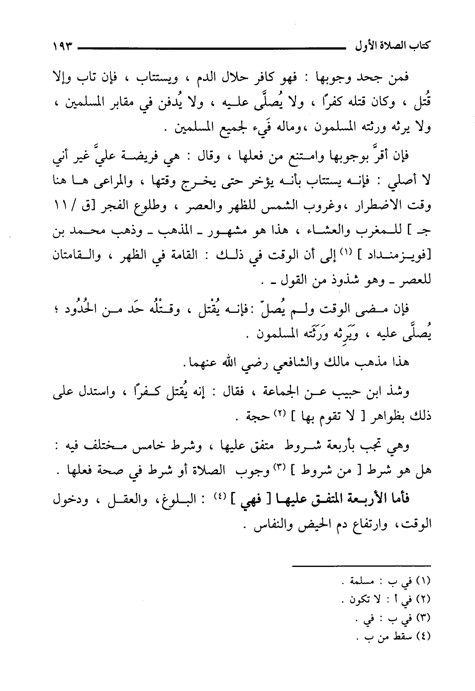 فإن أقرَّ بوجوبها وامتنع من فعلها، وقال: هي فريضة عليَّ غير أني لا أصلي: فإنه يستتاب بأنه يؤخر حتى يخرج وقتها، والمراعى هاهنا وقت الاضطرار، وغروب الشمس للظهر والعصر، وطلوع الفجر [ق/11 جـ] للمغرب والعشاء، هذا هو مشهور -المذهب- وذهب محمَّد بن [فويزمنداد] (¬1) إلى أن الوقت في ذلك: القامة في الظهر، والقامتان للعصر -وهو شذوذ من القول-.
