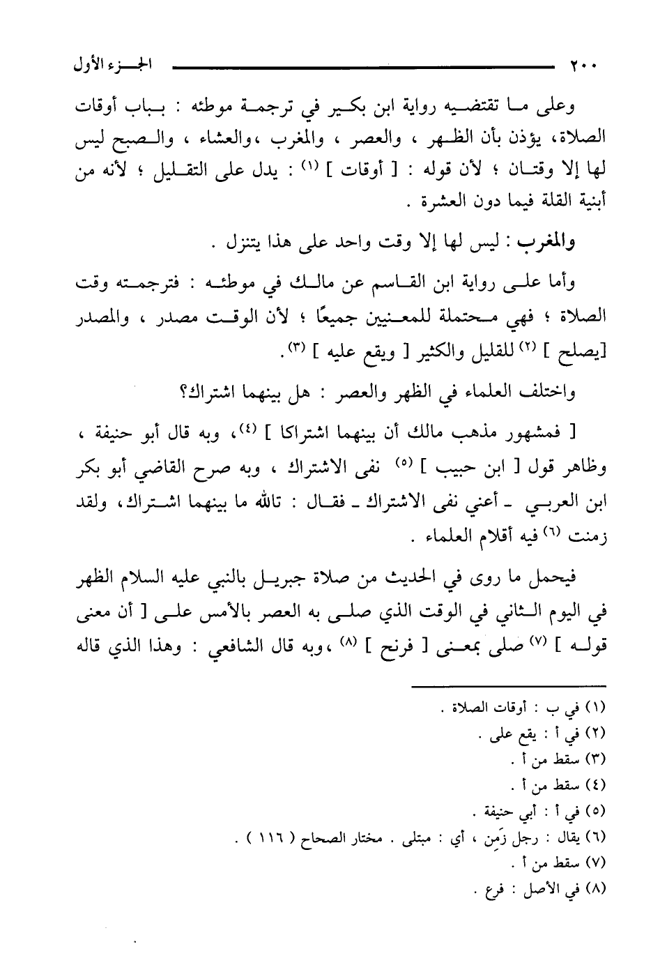 وعلى ما تقتضيه رواية ابن بكير في ترجمة موطئه: بباب أوقات الصلاة، يؤذن بأن الظهر، والعصر، والمغرب، والعشاء، والصبح ليس لها إلا وقتان؛ لأن قوله: [أوقات] (¬1): يدل على التقليل؛ لأنه من أبنية القلة فيما دون العشرة.