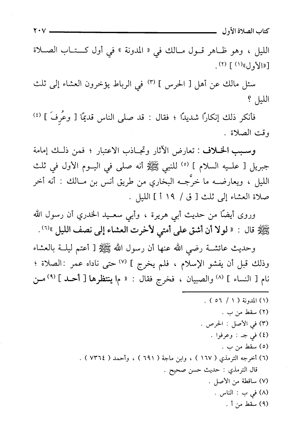 وسبب الخلاف: تعارض الآثار وتجاذب الاعتبار؛ فمن ذلك إمامة جبريل [عليه السلام] (¬5) للنبي - صلى الله عليه وسلم - أنه صلى في اليوم الأول في ثلث الليل، ويعارضه ما خرَّجه البخاري من طريق أنس بن مالك: أنه أخر صلاة العشاء إلى ثلث [ق/ 19 أ] الليل.