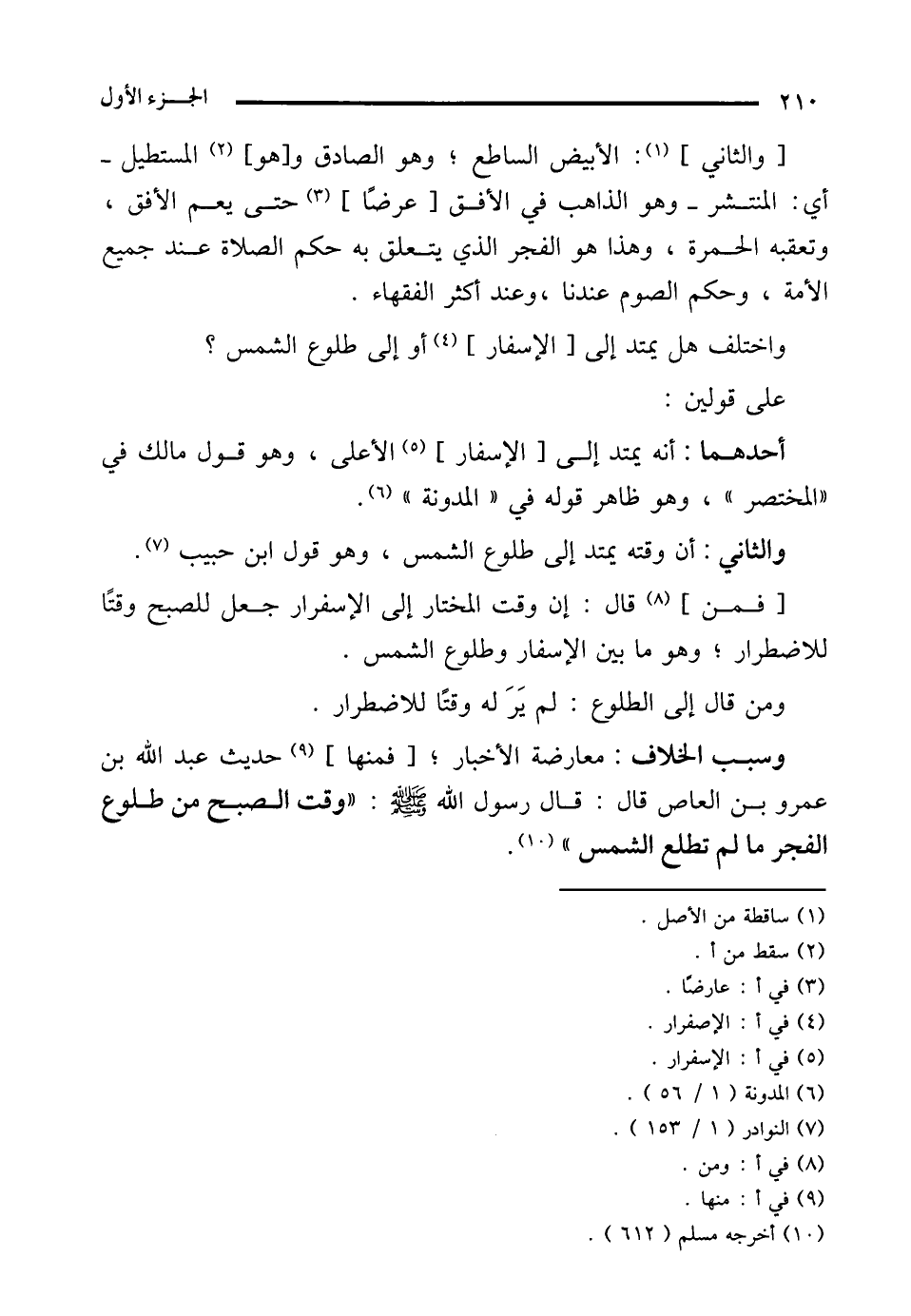 وسبب الخلاف: معارضة الأخبار؛ [فمنها] (¬9) حديث عبد الله بن عمرو بن العاص قال: قال رسول الله - صلى الله عليه وسلم -: "وقت الصبح من طلوع الفجر ما لم تطلع الشمس" (¬10).
