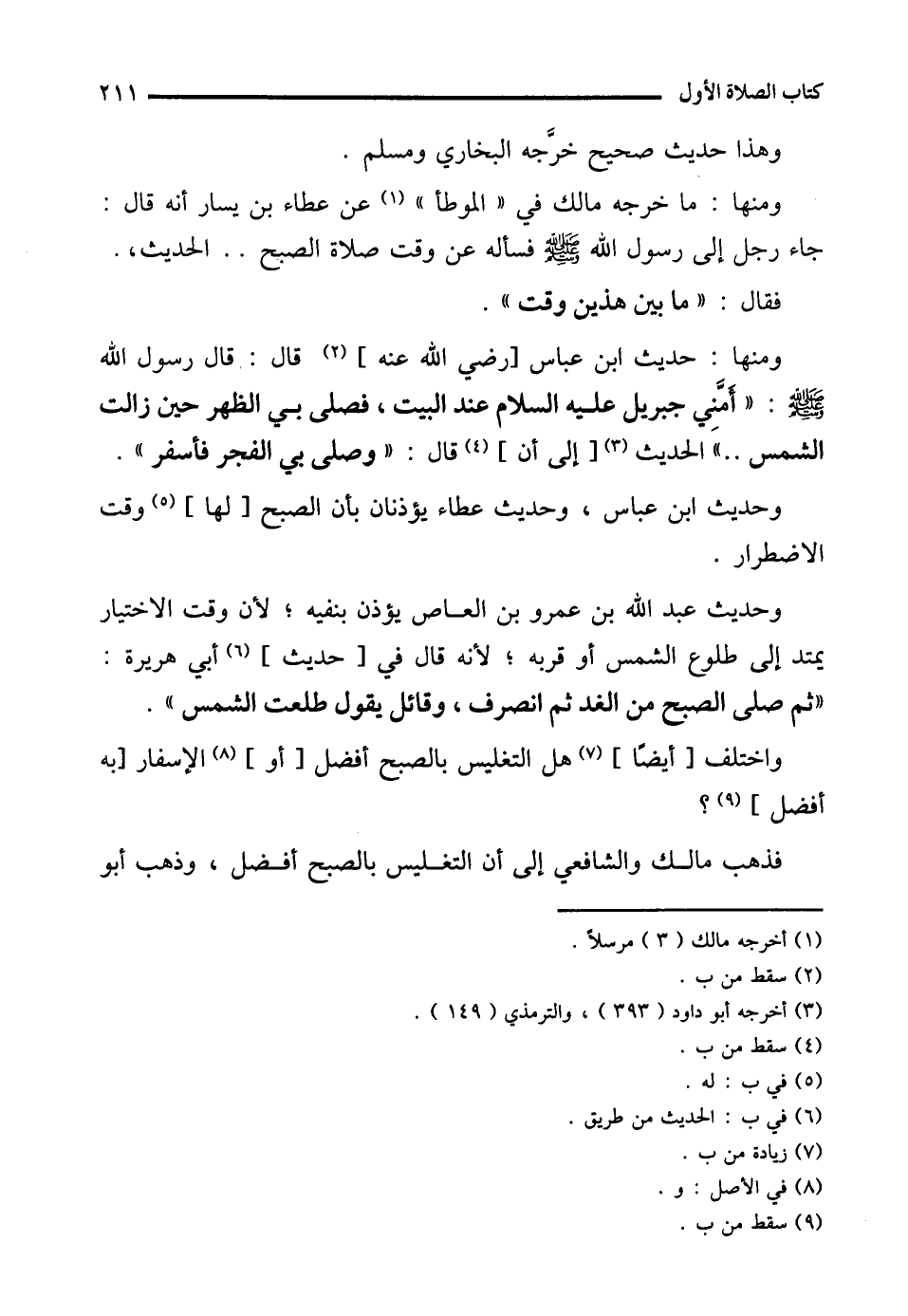 ومنها: حديث ابن عباس [رضي الله عنه] (¬2) قال: قال رسول الله - صلى الله عليه وسلم -: "أَمَّني جبريل عليه السلام عند البيت، فصلى بي الظهر حين زالت الشمس .. " الحديث (¬3) [إلى أن] (¬4) قال: "وصلى بي الفجر فأسفر".