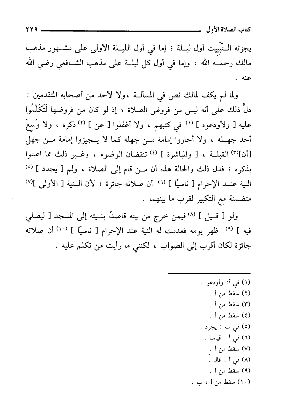 ولما لم يكف لمالك نص في المسألة، ولا لأحد من أصحابه المتقدمين: دل ذلك على أنه ليس من فروض الصلاة؛ إذ لو كان من فروضها لَتكَلّمُوا عليه [ولأودعوه] (¬1) في كتبهم، ولا أغفلوا [عن] (¬2) ذكره، ولا وَسِعَ أحد جهله، ولا أجازوا إمامة من جهله كما لا يجيزوا إمامة من جهل [أن] (¬3) القبلة، [والمباشرة] (¬4) تنقضان الوضوء، وغير ذلك مما اعتنوا بذكره؛ فدل ذلك والحالة هذه أن من قام إلى الصلاة، ولم [يجدد] (¬5) النية عند الإحرام [ناسيًا] (¬6) أن صلاته جائزة؛ لأن النية [الأولى] (¬7) متضمنة مع التكبير لقرب ما بينهما.