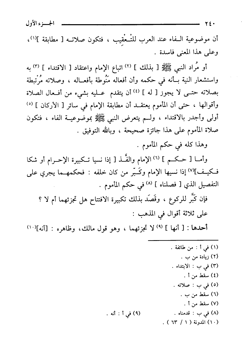 أو مُراد النبي - صلى الله عليه وسلم -[بذلك] (¬2) اتباع الإِمام واعتقاد [الاقتداء] (¬3) به واستشعار النية بأنه في حكمه وأن أفعاله مَنُوطة بأفعاله، وصلاته مُرْتبطة بصلاته حتى لا يجوز [له] (¬4) أن يتقدم عليه بشيء من أفعال الصلاة وأقوالها، حتى أن المأموم يعتقد أن مطابقة الإِمام في سائر [الأركان] (¬5) أولى وأجدر بالاقتداء، ولم يتعرض النبي - صلى الله عليه وسلم - بموضوعية الفاء، فتكون صلاة المأموم على هذا جائزة صحيحة، وبالله التوفيق.