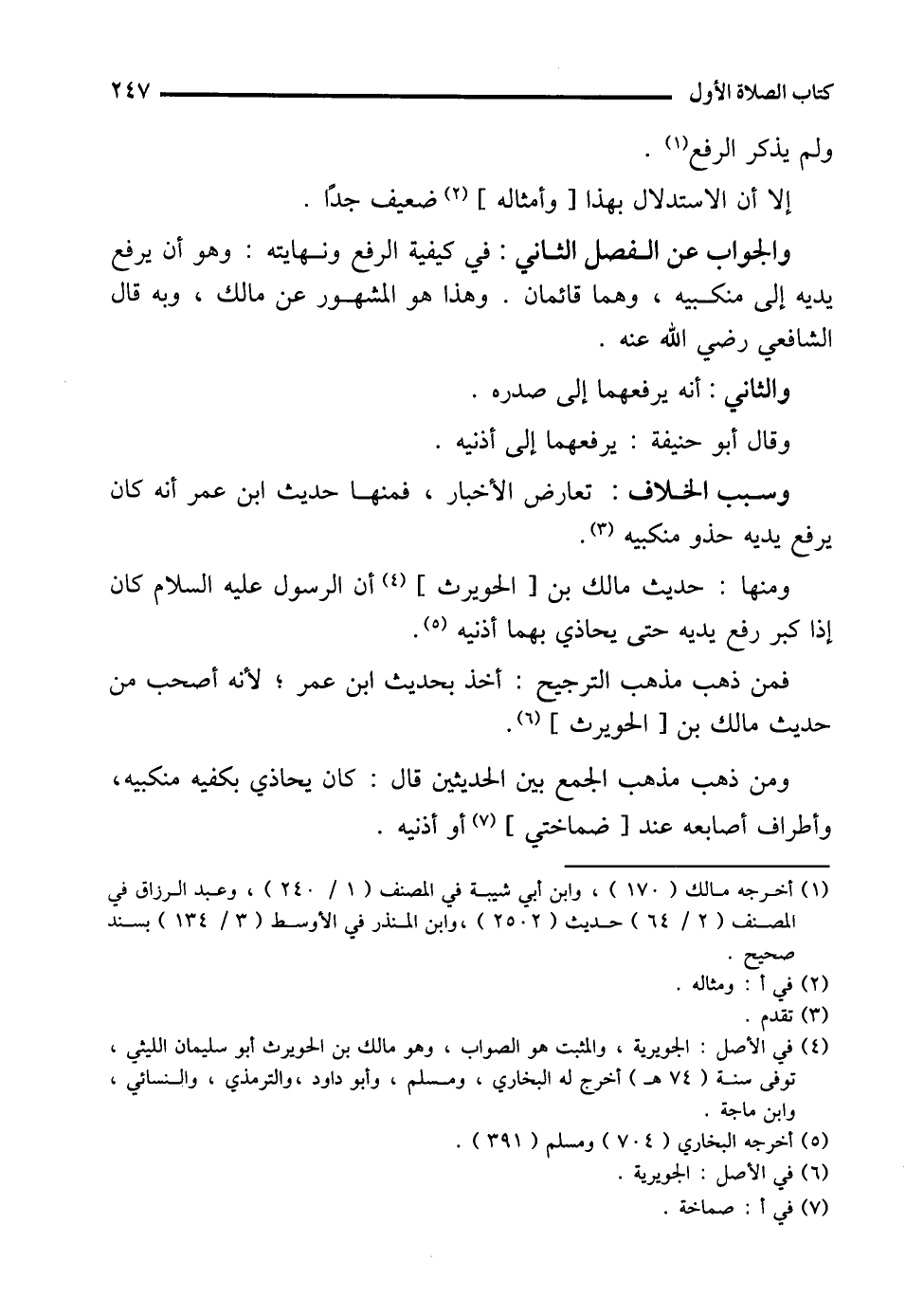 ومنها: حديث مالك بن [الحويرث] (¬4) أن الرسول عليه السلام كان إذا كبر رفع يديه حتى يحاذي بهما أذنيه (¬5).